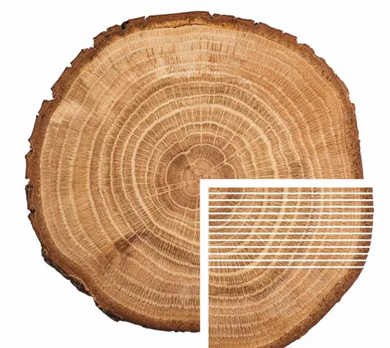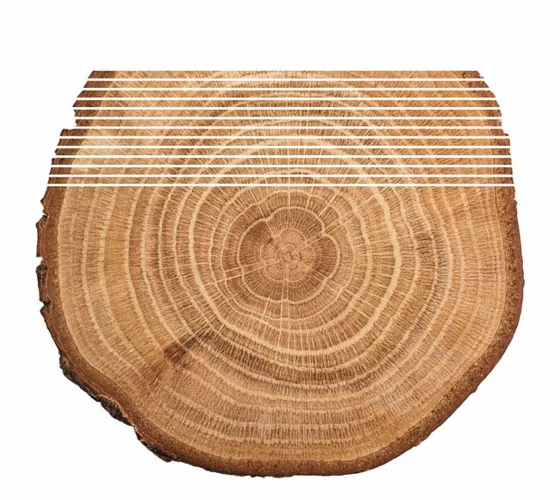 Primair kwartiers gezaagd eiken fineer, dat loodrecht op de jaarringenstructuur in het hout is gezaagd. Daarmee wordt een lineaire, egale nervenstructuur gecreëerd. Er kunnen verse knoesten van max. Ø6 mm in de fineer zitten, waardoor er geen barsten in het hout voorkomen. De fineerstroken met een breedte van 60-120 mm zijn aan de rand aan elkaar gelijmd.