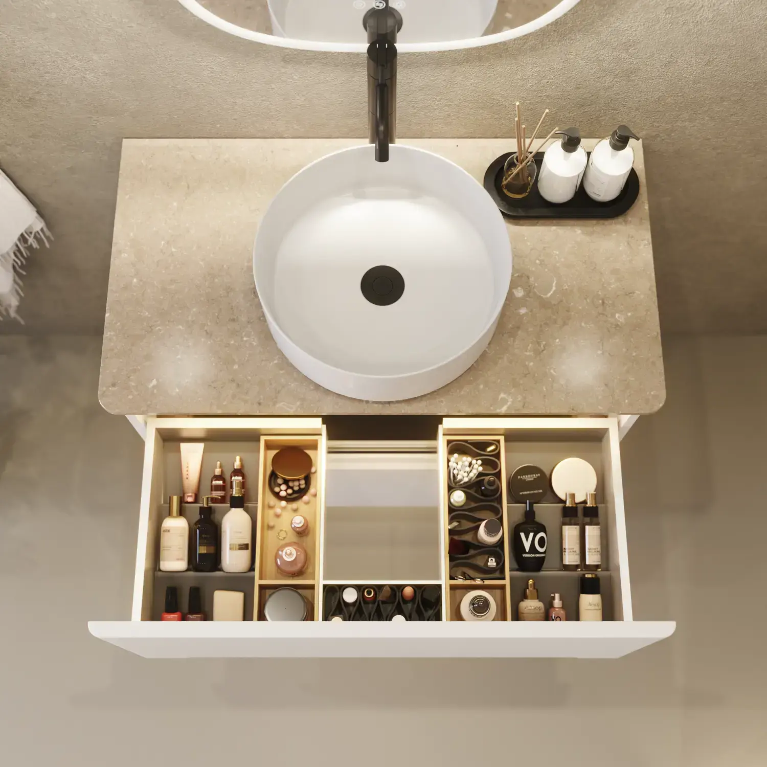 - Geïntegreerde stroomvoorziening: Sommige series bieden de mogelijkheid van een ingebouwd stopcontact in de lade. Hiermee zijn je scheerapparaat of elektrische tandenborstel altijd binnen handbereik en wordt het gemakkelijker om je dagelijkse verzorgingsroutines uit te voeren.