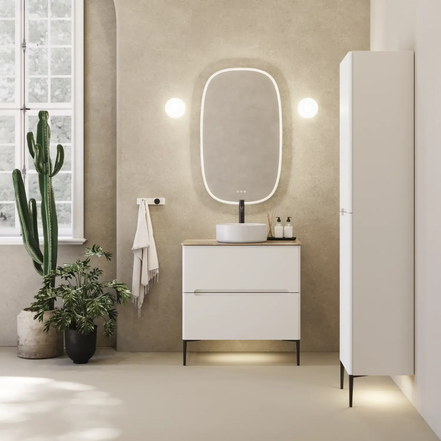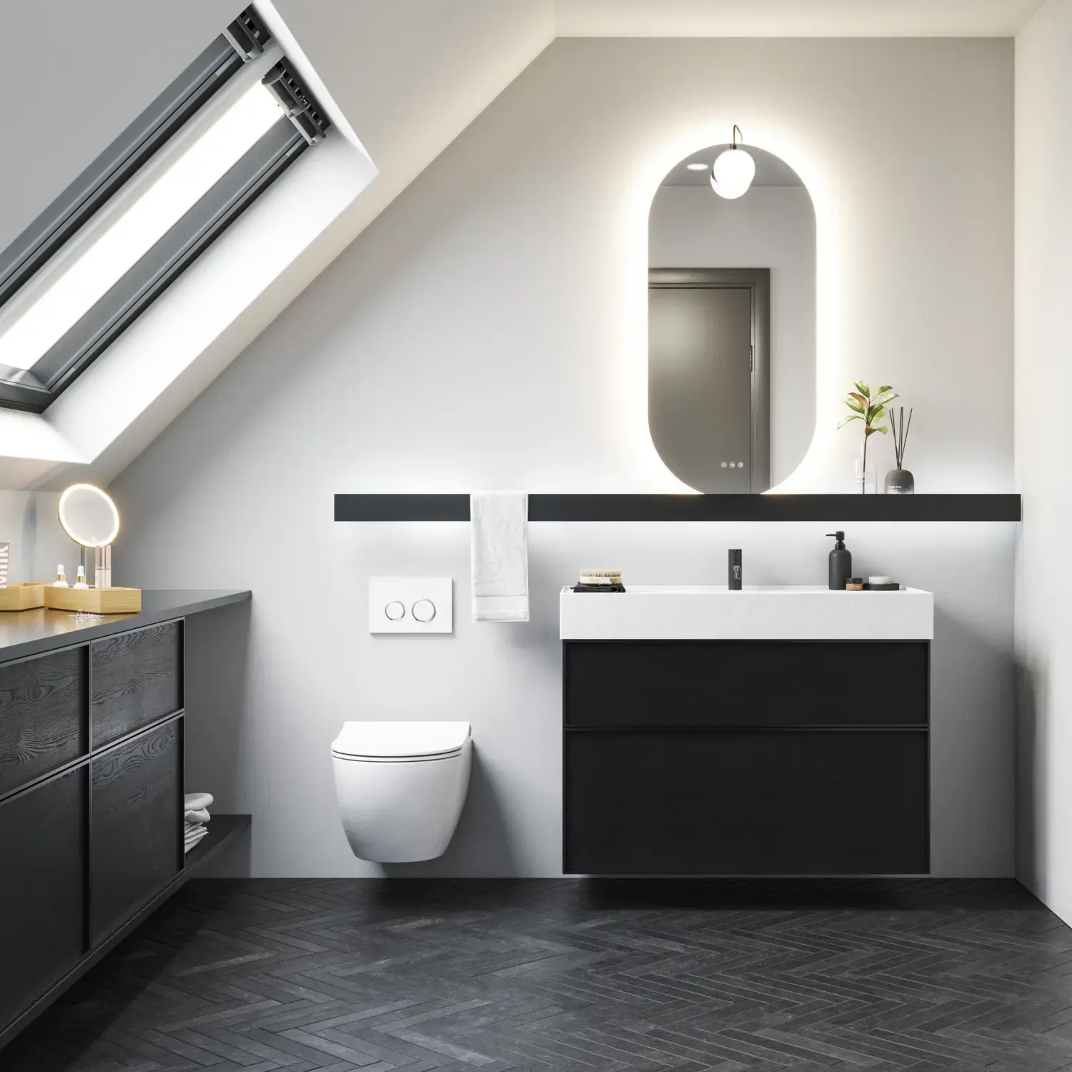 Lichte kleuren maken de ruimte groter, terwijl spiegels met geïntegreerde verlichting de illusie van meer ruimte creëren.