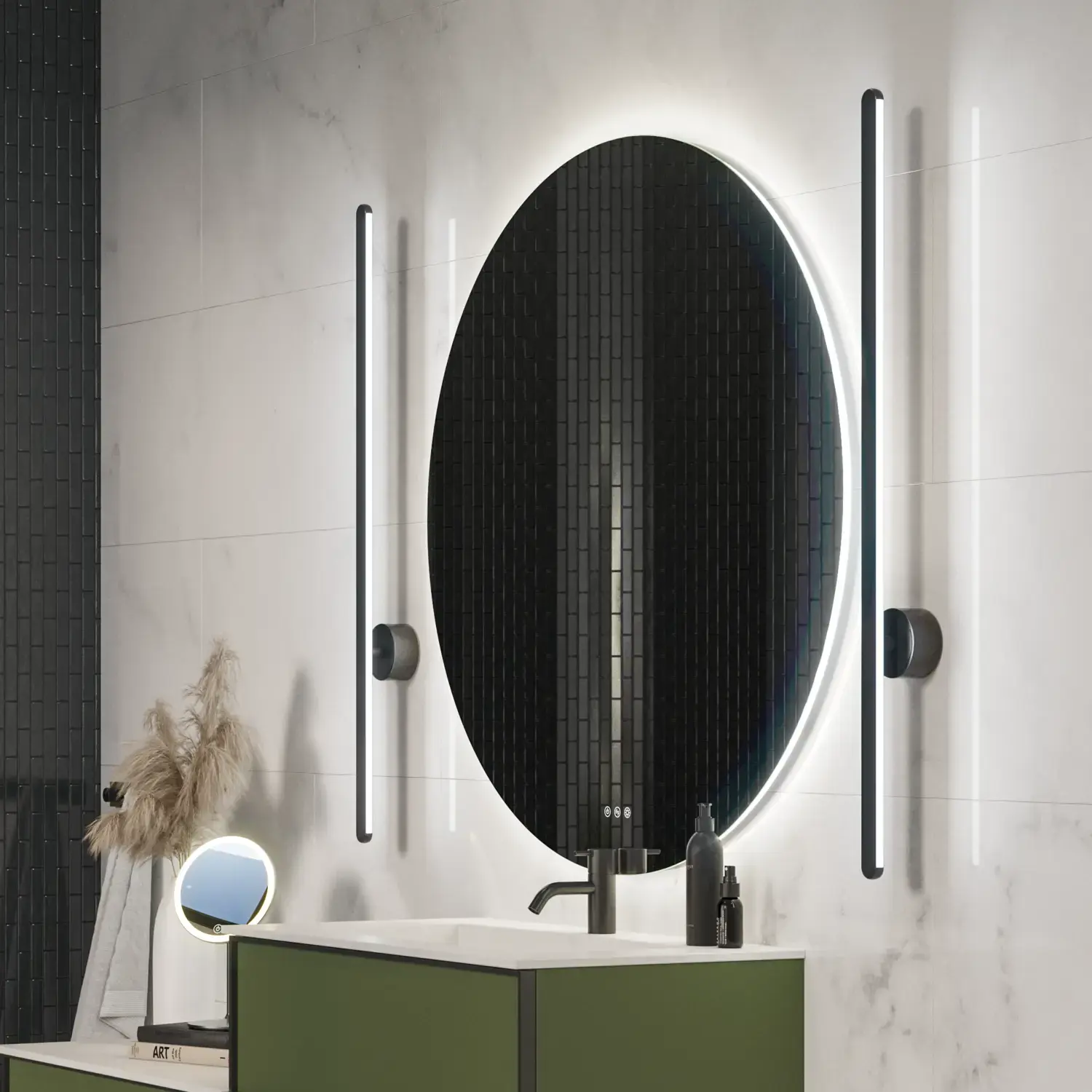Nu bieden we ook de mogelijkheid om spiegels, hanglampen en spots te groeperen, zodat ze samen kunnen worden bediend via de spiegel of een afstandsbediening. Dus een aanpassing van het spiegellicht zal ook de spots en hanglampen zowel wat betreft kleurtoon als helderheid aanpassen. De unieke draadloze bediening is eenvoudig in te stellen en vereist geen wifi-aansluiting – u hoeft slechts één extra ontvanger aan te schaffen om tot 5 hanglampen of 4 spots aan te sluiten.
