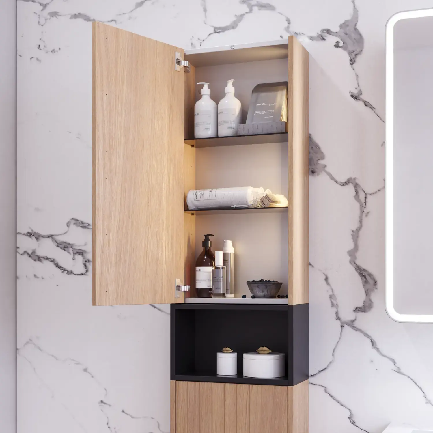 Net zoals het prettig is om een overzicht te hebben over alle kleine spulletjes in uw lade, is het prettig om te kunnen zien wat u in uw spiegelkast, hoge kast of bovenkast in de badkamer heeft. Aantrekkelijk, functioneel licht, dat door zijn verticale positie een overzicht biedt over verschillende planken en niet verblindt wanneer de kast geopend wordt, omdat het discreet in de zijkant van de kast geplaatst is.