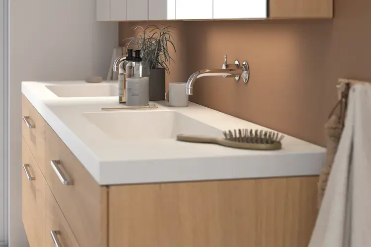 Houd je meer van "natuurlijke" materialen? Met verschillende houten oppervlakken haal je de buitenwereld in je badkamer. Kies voor lichte Scandinavische houten decors zoals natuur eiken of warm eiken als je een lichte Scandinavische stijl wilt creëren. Het gebruik van goud- en roodbruine houten afwerkingen zoals bruin eiken en goud eiken kan een mooie warme sfeer creëren. Donkere kleuren zoals zwart eiken drukken klassieke elegantie uit.