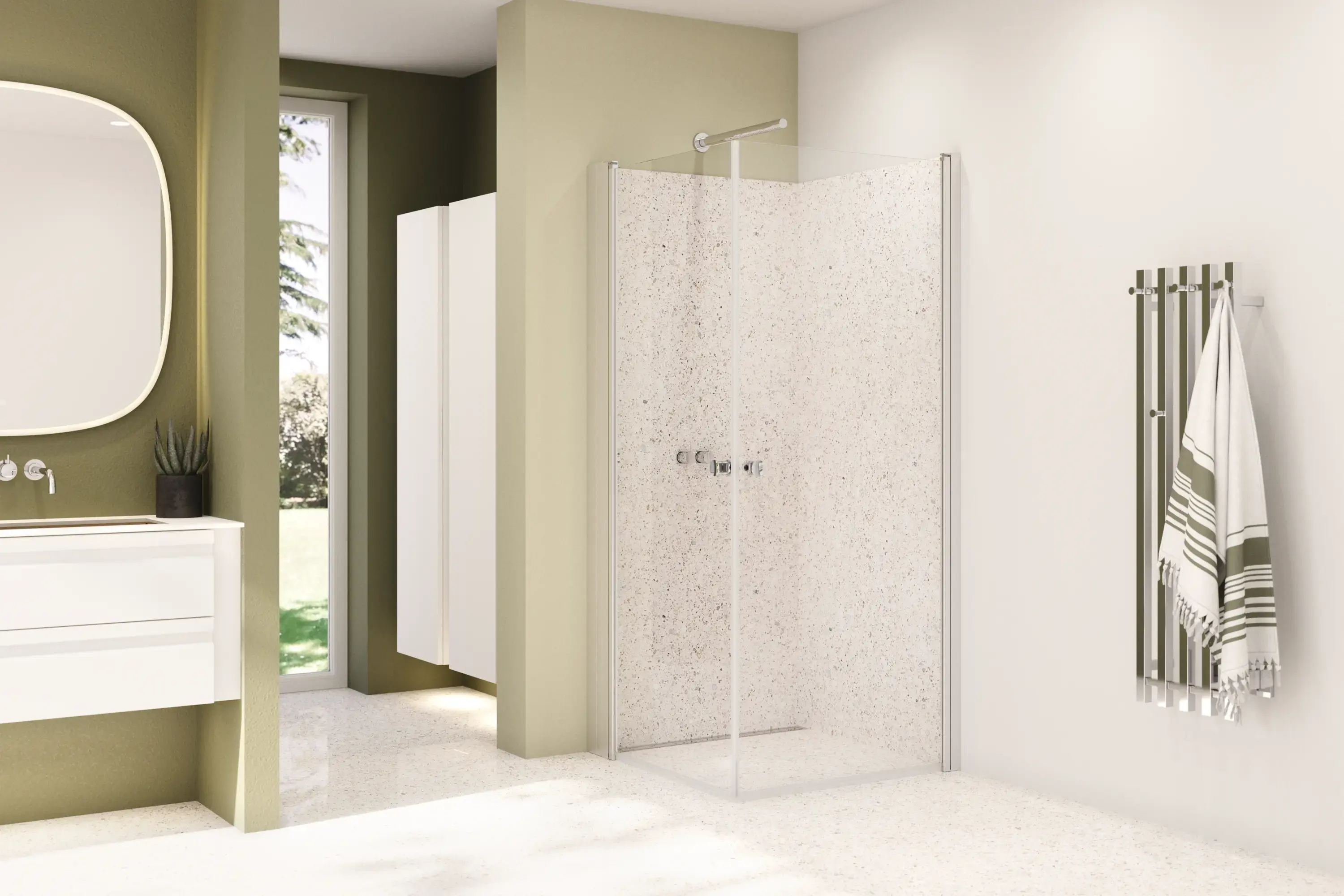 Zorgt voor meer ruimte in de badkamer, doordat de deur na gebruik opgevouwen kan worden. De douchewand kan gemeubileerd worden. Twee vouwdeuren kunnen samen ook een douchehoek vormen.