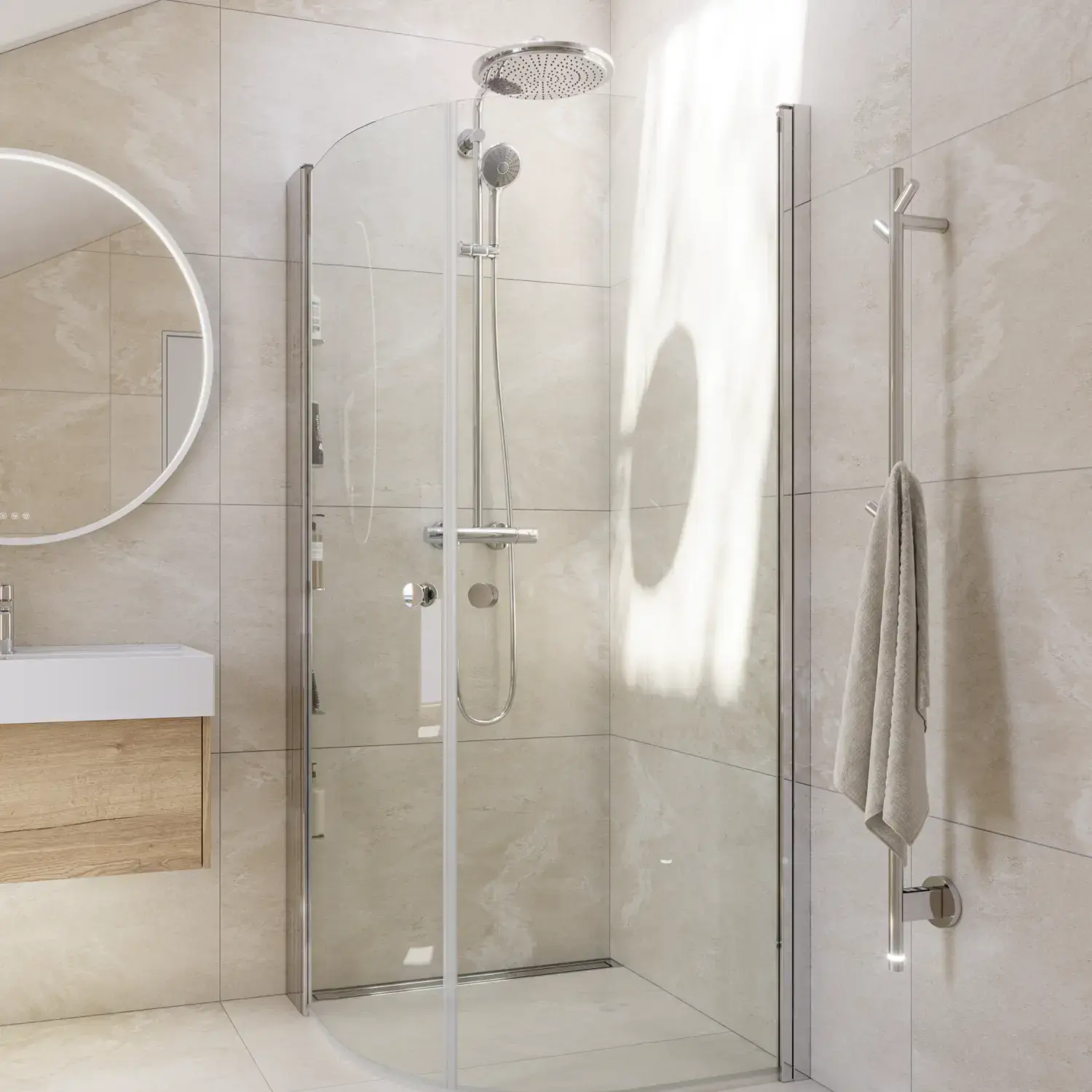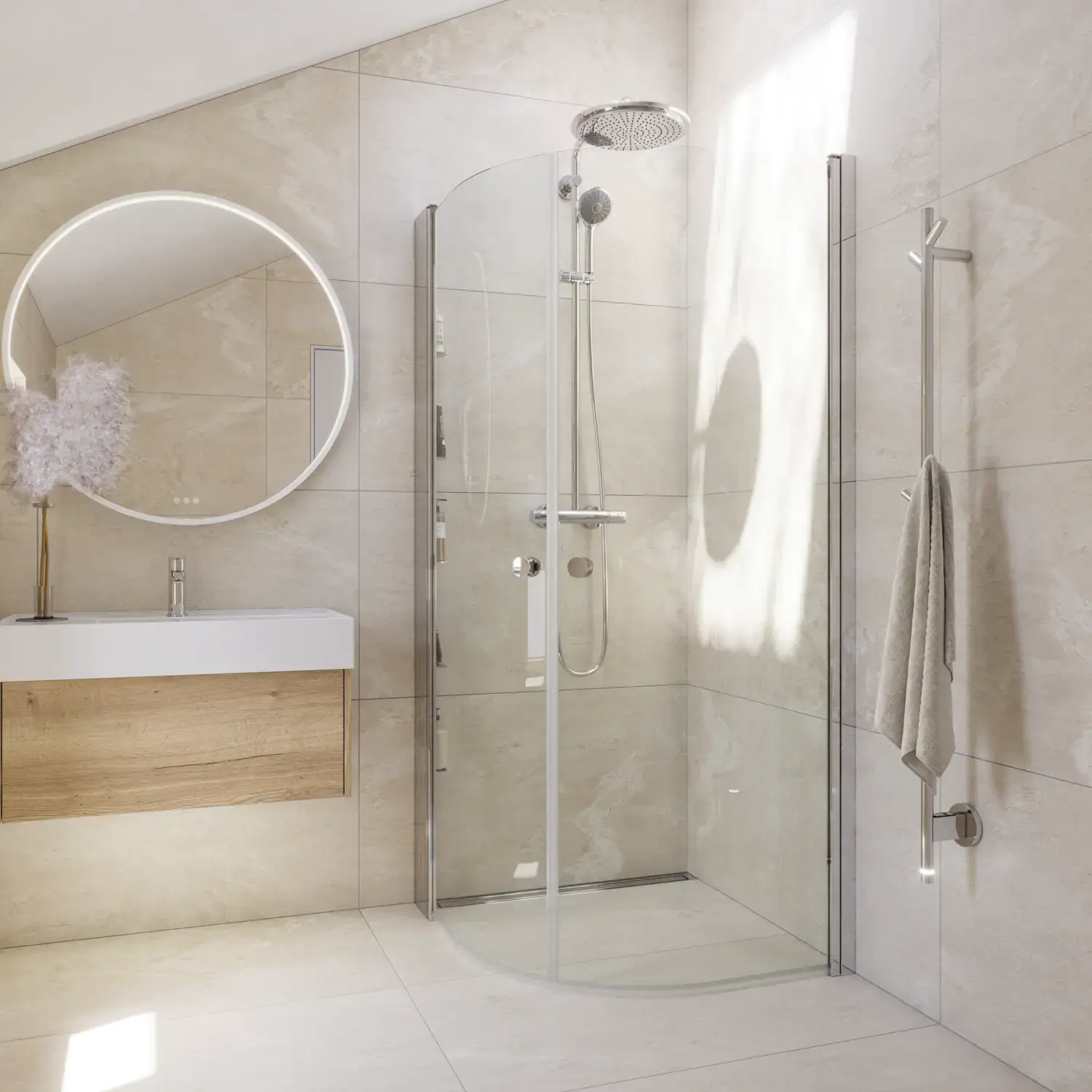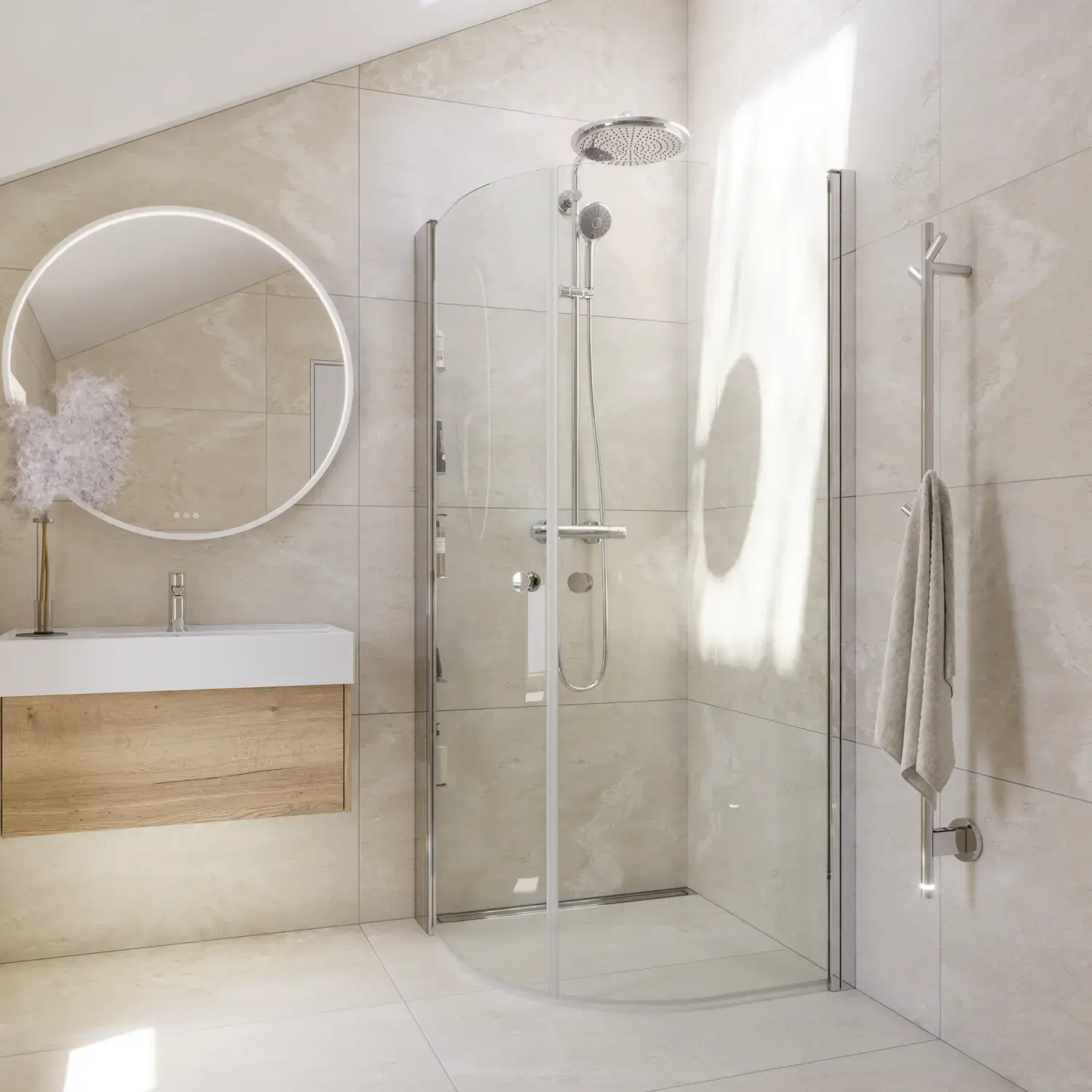 Kan naar binnen en naar buiten openen. Door het kwartronde design bespaart u ruimte in de badkamer. Twee kwartronde deuren kunnen samen een douchehoek vormen.