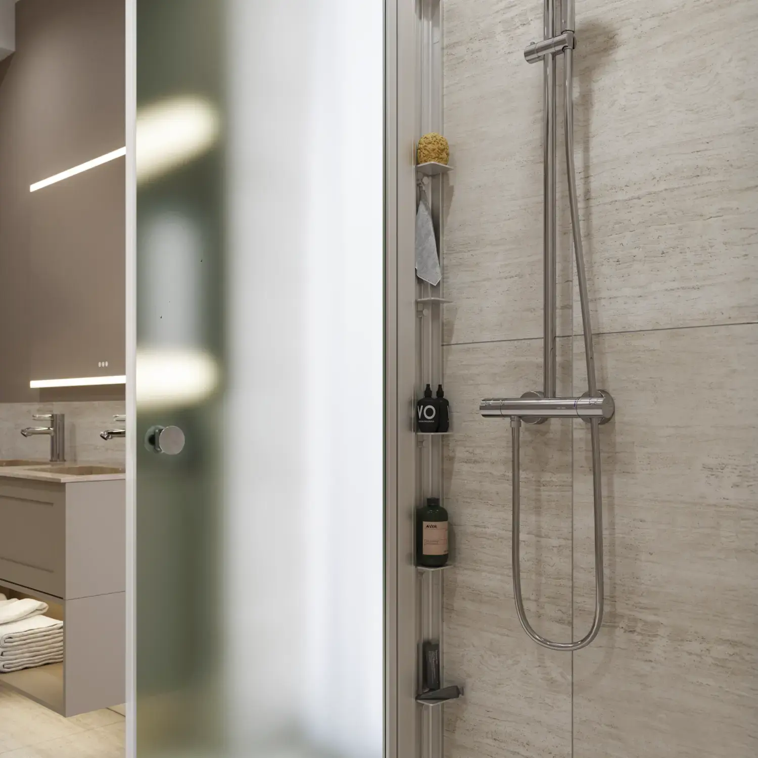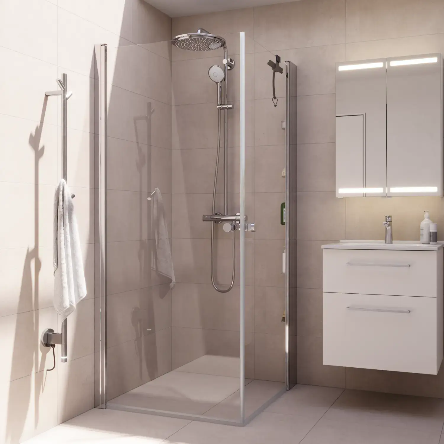 Het korte, vaste zijpaneel maakt het mogelijk tot dicht bij de douchehoek een meubel te plaatsen. Wanneer u de douche niet gebruikt, kunnen de deuren naar binnen worden gedraaid zonder het armatuur te raken, zodat u meer ruimte heeft.
