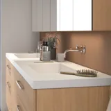 Voor een groot gezin of voor mensen die graag de ruimte hebben, is een dubbele wastafel een ideale oplossing in de nieuwe badkamer. Lades en kasten zijn verkrijgbaar in verschillende kleuren en we hebben werkbladen van minimalistische tinten tot sfeervolle houtstructuren. Alle lades bevatten ruimtebesparende bakjes en ingebouwde dempers, die ervoor zorgen dat de lades geruisloos sluiten.