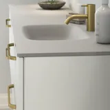 Het ultradunne materiaal solid surface heeft een matwit oppervlak. In tegenstelling tot de opvallend slanke en scherpe buitenlijnen heeft de binnenkant van de wastafels een zacht design dat makkelijk schoon te maken is. Door het dunne design moeten de wastafel en het werkblad over de volledige breedte van de kasten worden ondersteund.