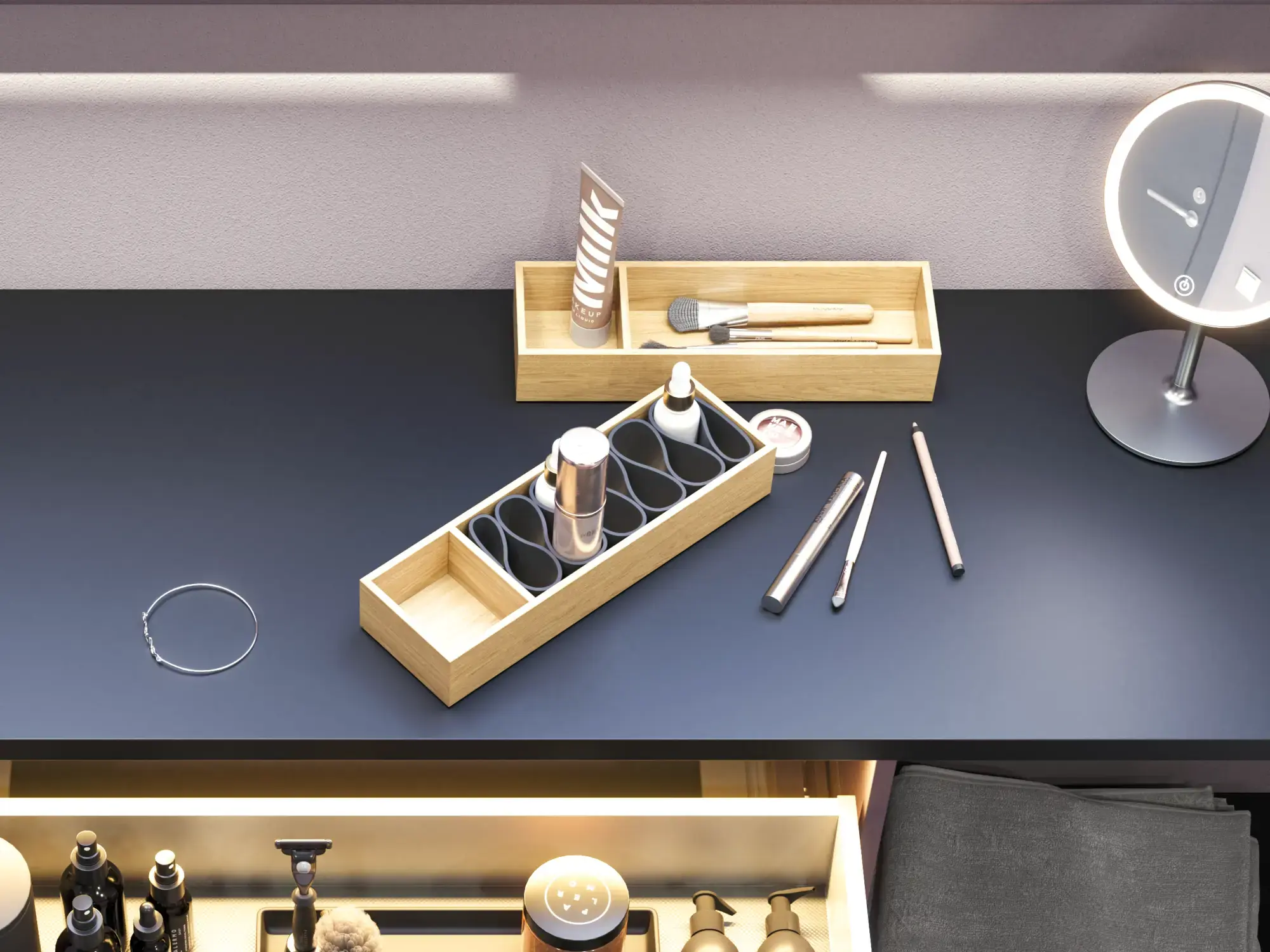 Je kunt ook kiezen voor onze slimme houten dienbladen om je make-up georganiseerd op te bergen of een mooi krukje zodat je comfortabel kunt zitten terwijl je je make-up aanbrengt.