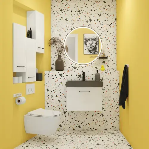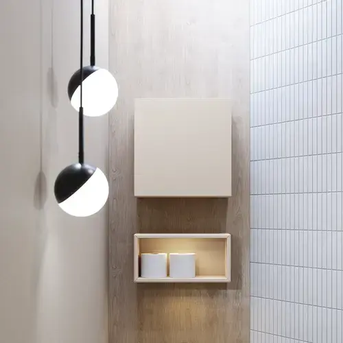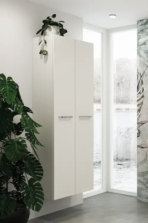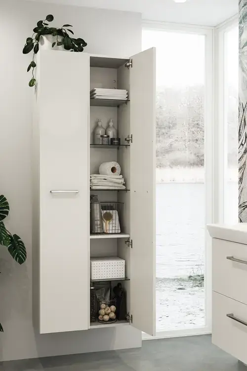 De traditionele opties om meer opbergruimte te creƫren zijn hoge kasten, boven- of onderkasten, die rond de wasbak zijn geplaatst. Maar vaak is er meer ongebruikte muurruimte in de badkamer, bijv. achter de deur of boven de radiator of het toilet. Kies daarom voor een bovenkast boven het toilet, zodat u bijv. het toiletpapier altijd bij de hand heeft. U kunt extra opbergruimte creƫren met hoge kasten, boven- of onderkasten, ongeacht of u een kleine of een grote badkamer heeft.