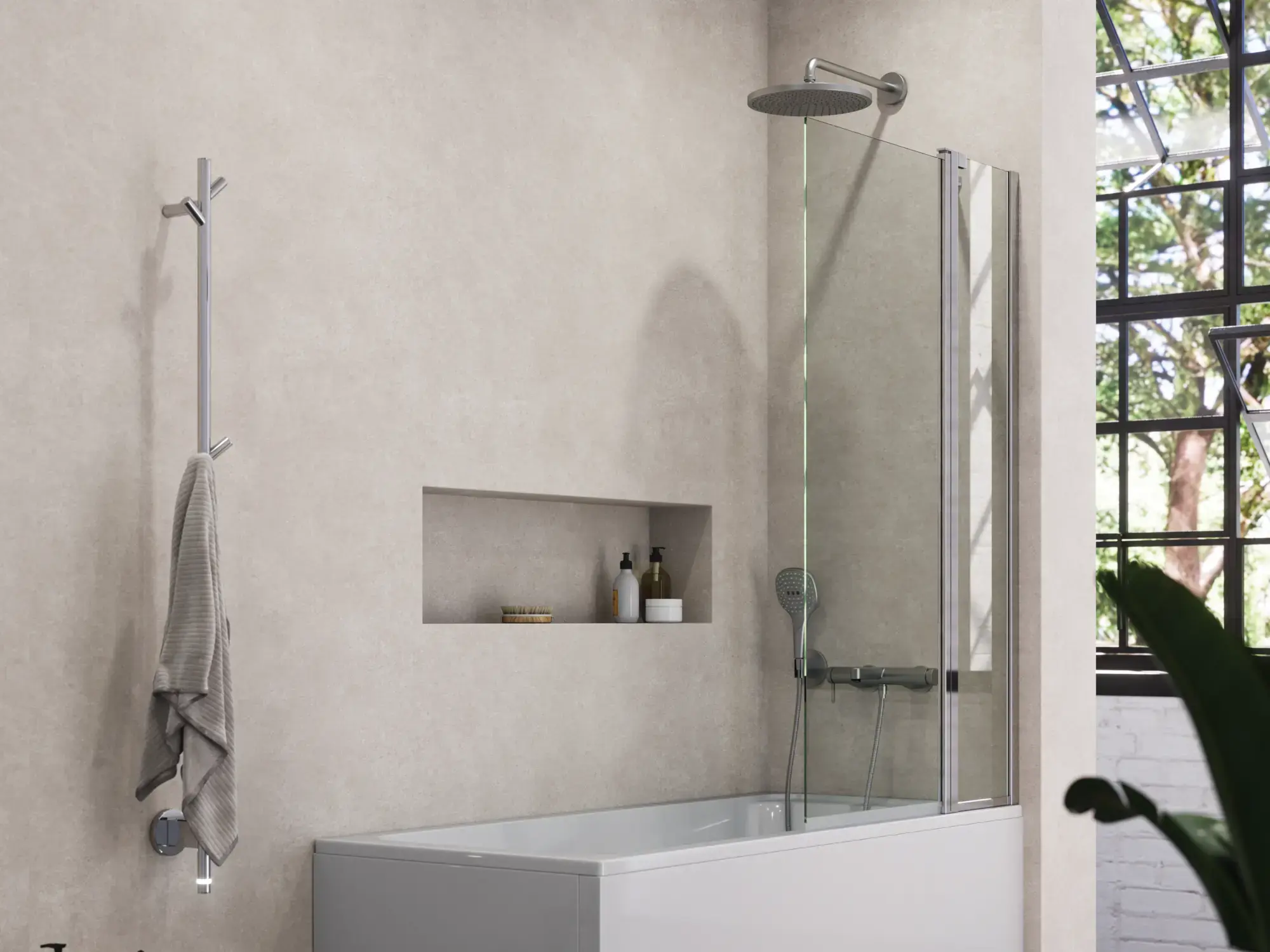 Kalkaanslag op de spiegel & meubelen en een natte vloer zijn vaak het resultaat als de douche in bad staat. Een van de ideeën om dit te voorkomen in een kleine badkamer is een licht en elegant badscherm dat na gebruik voor de douche en de armaturen kan worden geschoven en tegelijkertijd ruimte in de badkamer vrijmaakt.