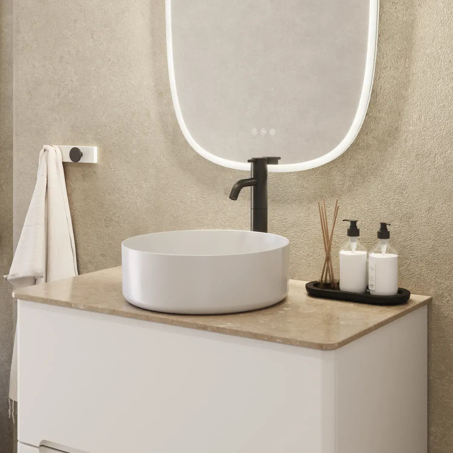 Dansani biedt 25 mm dikke gelamineerde bladen in de Luna-serie, die perfect matchen met de andere meubels qua kleur en afwerking. Zo ontstaat er een harmonieus en consistent geheel, zeker als je kiest voor een opzetwastafel op een blad met hetzelfde decor als de onderkast.