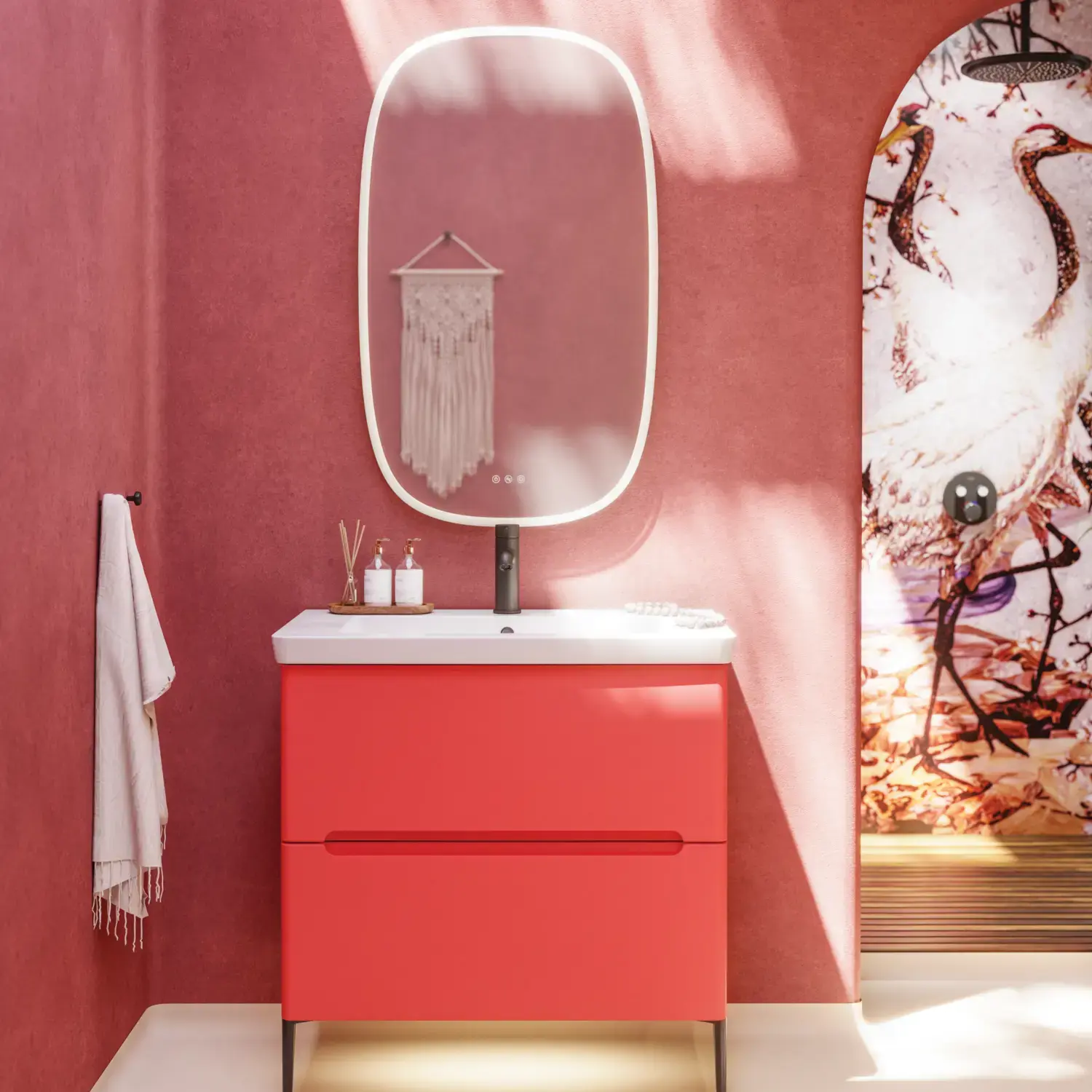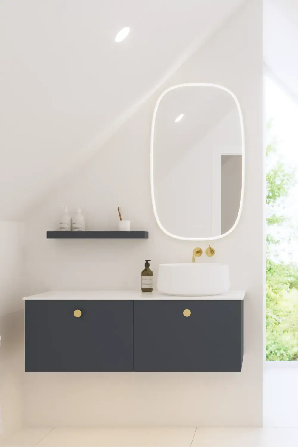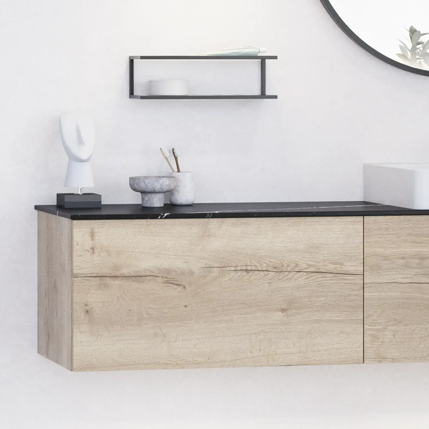 - Door de zachte vorm passen de twee modellen zowel op 60/80/100/120+ badmeubels.