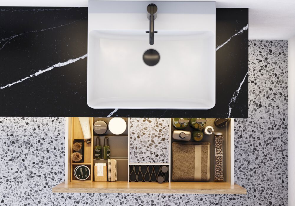Om zowel functionaliteit als sfeer in je badkamer te optimaliseren, kun je verlichting toevoegen onder de wastafelonderkast of in de lades voor beter overzicht en een gezellige ambiance. Verlichting onder je wastafelonderkast biedt ook goede nachtverlichting, zodat je niet het hele badkamerlicht hoeft aan te doen als je 's nachts opstaat. Bij ons kun je ook praktische stopcontacten in de lades krijgen, zodat je je elektrische tandenborstel, föhn of scheerapparaat direct in de lade kunt aansluiten – een handige en slimme oplossing om alles georganiseerd te houden. Dit draagt bij aan rust in de badkamer, omdat spullen niet rondzwerven en het aanzicht verstoren.