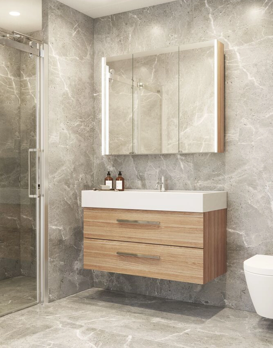 Ervaar zowel mooi design als functionaliteit met de Ambi spiegelkast. De spiegelkast biedt veel extra opbergruimte en wordt geleverd met een vergrootspiegel, metalen planchet en magneetstrip. Binnenin vind je ook een handig stopcontact en twee USB-poorten die je kunt gebruiken voor je scheerapparaat, föhn of wanneer je je elektrische tandenborstel moet opladen. De Ambi spiegelkast is natuurlijk verkrijgbaar in kleuren, zodat je een spiegelkast krijgt die bij je badkamermeubels past. Let op: er geldt een opstarttarief (BI1) voor producten met wenskleur. Deze wordt eenmalig betaald per wenskleur, ongeacht het aantal producten.