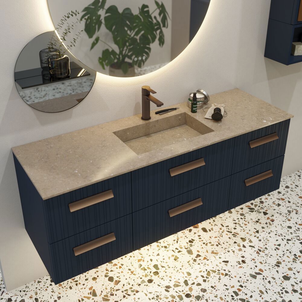 Met de Angular wastafel krijg je niet alleen een elegant en hoekig design, maar ook de mogelijkheid om een wastafel te krijgen die perfect bij je badkamer past. De wastafel kan op maat worden gemaakt, wat betekent dat deze precies kan worden aangepast aan je behoeften en de afmetingen van de ruimte. Deze flexibiliteit maakt de Angular wastafel de ideale keuze wanneer je een wastafel wilt die zowel functioneel is als zich naadloos integreert in het ontwerp van je badkamer. De wastafel is ontwikkeld in samenwerking met Cosentino en is beschikbaar in zowel de klassieke Silestone afwerkingen als de nieuwe, duurzame Trilium afwerking in Dekton. Trilium valt op door zijn ruwe, tegelachtige uitstraling en is gemaakt van tot 80% gerecycled materiaal, wat de wastafel een extra milieuvriendelijk tintje geeft. De elegante ontwerpfilosofie omvat een schuin bassin dat het water efficiënt naar een verborgen afvoer leidt, wat resulteert in een zowel stijlvolle als praktische design. De Silestone en Dekton materialen zijn niet alleen mooi, maar ook duurzaam, aangezien ze worden geproduceerd met hernieuwbare energie en 99% van het water in de productie wordt gerecycled.