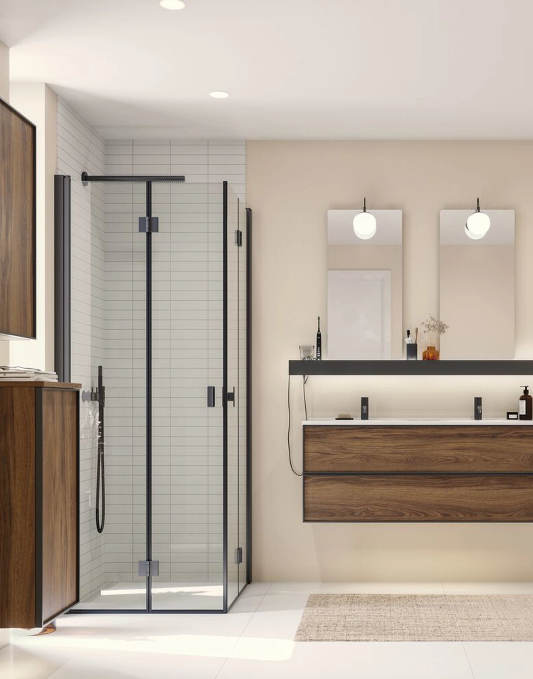 De vouwdeuren kunnen eenvoudig worden ingeklapt als de douchewand niet in gebruik is, waardoor er ruimte vrijkomt in de badkamer. De vouwdeuren zijn gemaakt van hoogwaardige materialen, waaronder gehard veiligheidsglas en stevige aluminium frames, die duurzaamheid en stabiliteit op lange termijn garanderen. Ze zijn eenvoudig te bedienen met soepele en betrouwbare scharnieren die ervoor zorgen dat de deuren naadloos openen en sluiten. Door te kiezen voor opvouwbare douchedeuren kun je de ruimte in je badkamer maximaliseren en een functionele en luchtige doucheruimte creëren.