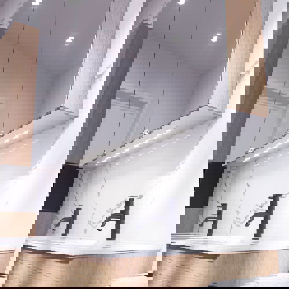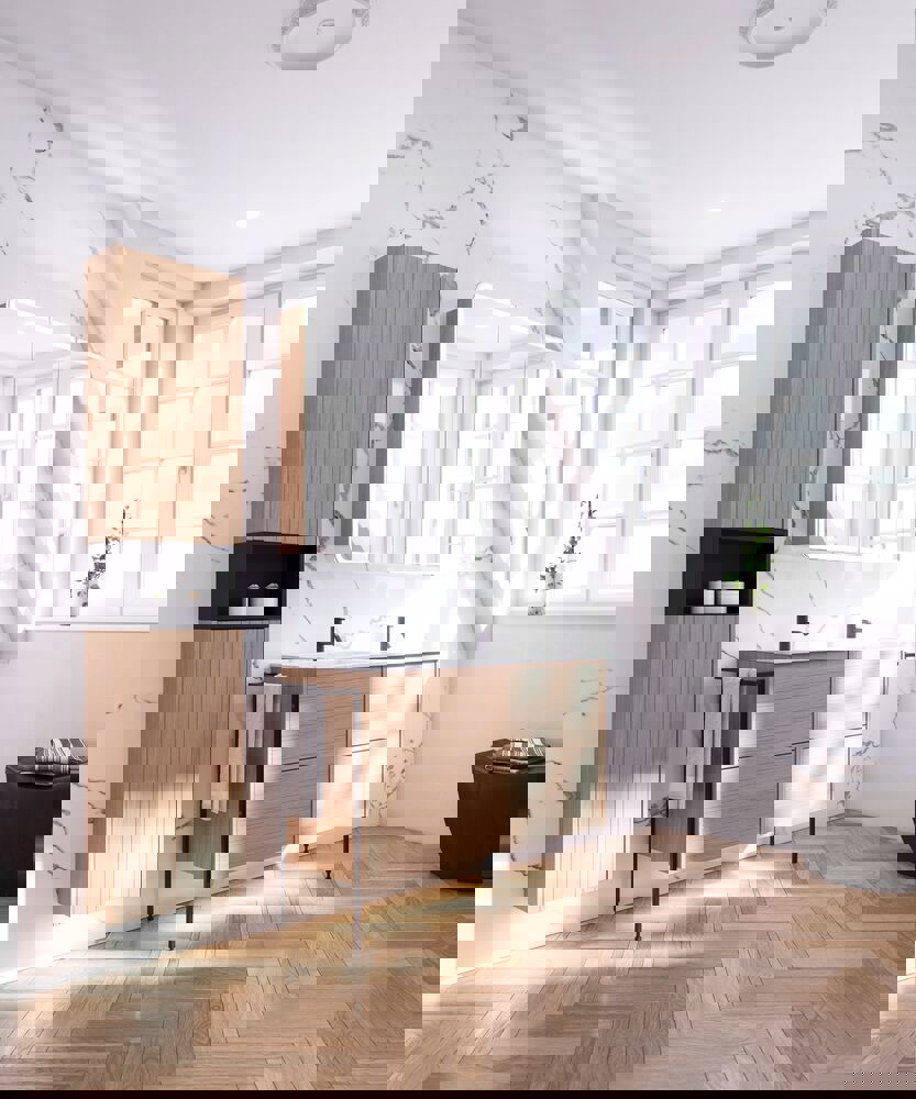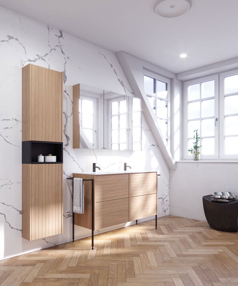 Creëer een gezellige en uitnodigende sfeer met een bovenkast met een gegroefd front. De twee glazen planken bieden veel mogelijkheden om uw favorieten te organiseren en tentoon te stellen, terwijl het unieke ontwerp karakter toevoegt aan uw badkamer. Met een breedte van 40 cm en een diepte van 19 cm is deze kast perfect voor het maximaliseren van opbergruimte. In combinatie met een open plank krijgt u een slimme en stijlvolle oplossing die zowel functionaliteit als persoonlijkheid in de ruimte benadrukt. Vergeet niet de kleine praktische dingen aan je badkamermeubels toe te voegen waar je dagelijks plezier van hebt. Bijvoorbeeld verlichting in lades en kastjes, ingebouwde stopcontacten en gedimde sensorlampjes onder de meubels om nachtelijke bezoeken aan de badkamer te begeleiden. Opties worden tegelijk met je meubels bested.