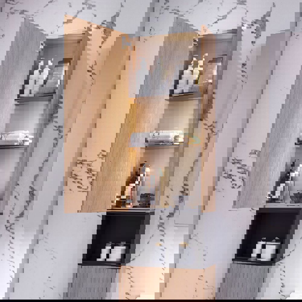 Creëer een gezellige en uitnodigende sfeer met een bovenkast met een gegroefd front. De twee glazen planken bieden veel mogelijkheden om uw favorieten te organiseren en tentoon te stellen, terwijl het unieke ontwerp karakter toevoegt aan uw badkamer. Met een breedte van 40 cm en een diepte van 19 cm is deze kast perfect voor het maximaliseren van opbergruimte. In combinatie met een open plank krijgt u een slimme en stijlvolle oplossing die zowel functionaliteit als persoonlijkheid in de ruimte benadrukt. Vergeet niet de kleine praktische dingen aan je badkamermeubels toe te voegen waar je dagelijks plezier van hebt. Bijvoorbeeld verlichting in lades en kastjes, ingebouwde stopcontacten en gedimde sensorlampjes onder de meubels om nachtelijke bezoeken aan de badkamer te begeleiden. Opties worden tegelijk met je meubels bested.