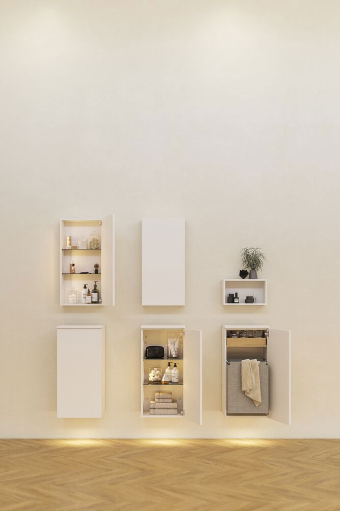 Maak ruimte vrij en organiseer je badkamer met onze bovenkasten. Deze ondiepe kast is verkrijgbaar met 2 glazen planchets en is zowel stijlvol als functioneel. Gebruik de kast om je crèmes, deodorants, enz. georganiseerd in de badkamer op te bergen. De kast is verkrijgbaar in verschillende kleuren om bij de rest van je badkamer te passen. Let op: er geldt een opstarttarief (BI1) voor producten met wenskleur. Deze wordt eenmalig betaald per wenskleur, ongeacht het aantal producten. Vergeet niet de kleine praktische dingen aan je badkamermeubels toe te voegen waar je dagelijks plezier van hebt. Bijvoorbeeld verlichting in lades en kastjes, ingebouwde stopcontacten en gedimde sensorlampjes onder de meubels om nachtelijke bezoeken aan de badkamer te begeleiden. Opties worden tegelijk met je meubels bested.