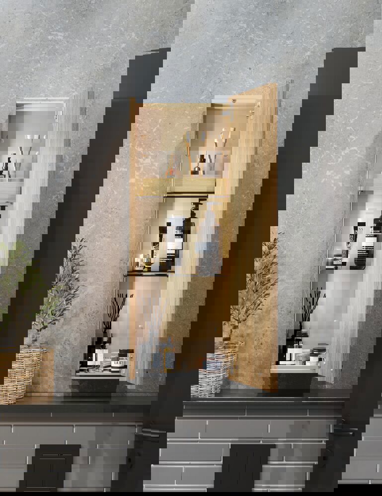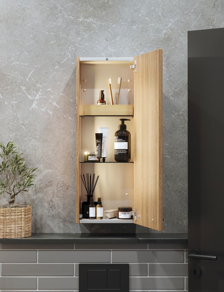 Maak ruimte vrij en organiseer je badkamer met onze bovenkasten. Deze ondiepe kast is verkrijgbaar met 2 glazen planchets en is zowel stijlvol als functioneel. Gebruik de kast om je crèmes, deodorants, enz. georganiseerd in de badkamer op te bergen. De kast is verkrijgbaar in verschillende kleuren om bij de rest van je badkamer te passen. Let op: er geldt een opstarttarief (BI1) voor producten met wenskleur. Deze wordt eenmalig betaald per wenskleur, ongeacht het aantal producten. Vergeet niet de kleine praktische dingen aan je badkamermeubels toe te voegen waar je dagelijks plezier van hebt. Bijvoorbeeld verlichting in lades en kastjes, ingebouwde stopcontacten en gedimde sensorlampjes onder de meubels om nachtelijke bezoeken aan de badkamer te begeleiden. Opties worden tegelijk met je meubels bested.