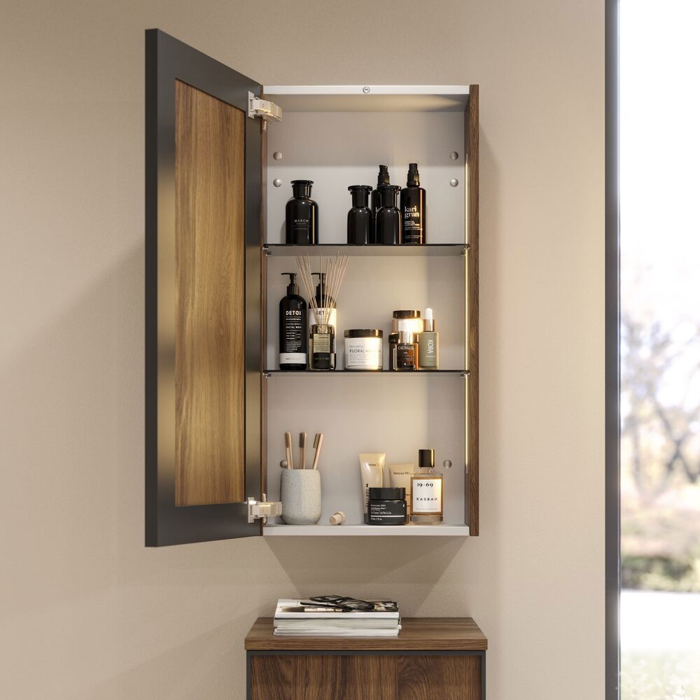 Voeg extra opbergruimte toe met het Dansani bovenkastje met een zwart frame en 2 glazen planken, wat een moderne en elegante oplossing biedt voor je badkamer. Het zwarte frame voegt een verfijnd uiterlijk toe dat goed past bij moderne badkamerinrichtingen. Gebruik de bovenkast om je crèmes, deodorant en andere essentiële producten netjes te houden, zodat je badkamer altijd georganiseerd en stijlvol oogt. Met verschillende kleurkeuzes kun je gemakkelijk een kast kiezen die past bij de rest van je badkamer. Let op: er geldt een opstarttarief (BI1) voor producten met wenskleur. Deze wordt eenmalig betaald per wenskleur, ongeacht het aantal producten. Vergeet niet de kleine praktische dingen aan je badkamermeubels toe te voegen waar je dagelijks plezier van hebt. Bijvoorbeeld verlichting in lades en kastjes, ingebouwde stopcontacten en gedimde sensorlampjes onder de meubels om nachtelijke bezoeken aan de badkamer te begeleiden. Opties worden tegelijk met je meubels bested.
