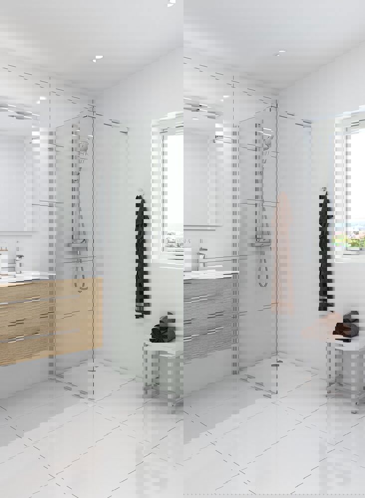 De vaste wanden zijn ontworpen met de focus op het creëren van een ruime en stijlvolle doucheruimte die volledig kan worden aangepast aan jouw persoonlijke stijl en badkamerinrichting. Onze vaste wanden kunnen gecombineerd worden met andere douchewanden of douchedeuren, zodat je een oplossing kunt maken die perfect in jouw badkamer past. Misschien heb je veel ruimte en kun je een inloopdouche creëren? Of misschien wil je de vaste wand combineren met een draaideur voor een stabiele en veilige oplossing? Wat je ook kiest, je kunt de oplossing vinden die het beste bij je past. Het glas in de vaste wanden is behandeld met EasyCare, een speciale coating die water en zeepresten afstoot, waardoor schoonmaken veel eenvoudiger wordt. Het glas is gehard en de sterke constructie en solide materialen zorgen ervoor dat de wanden stabiel en veilig zijn.