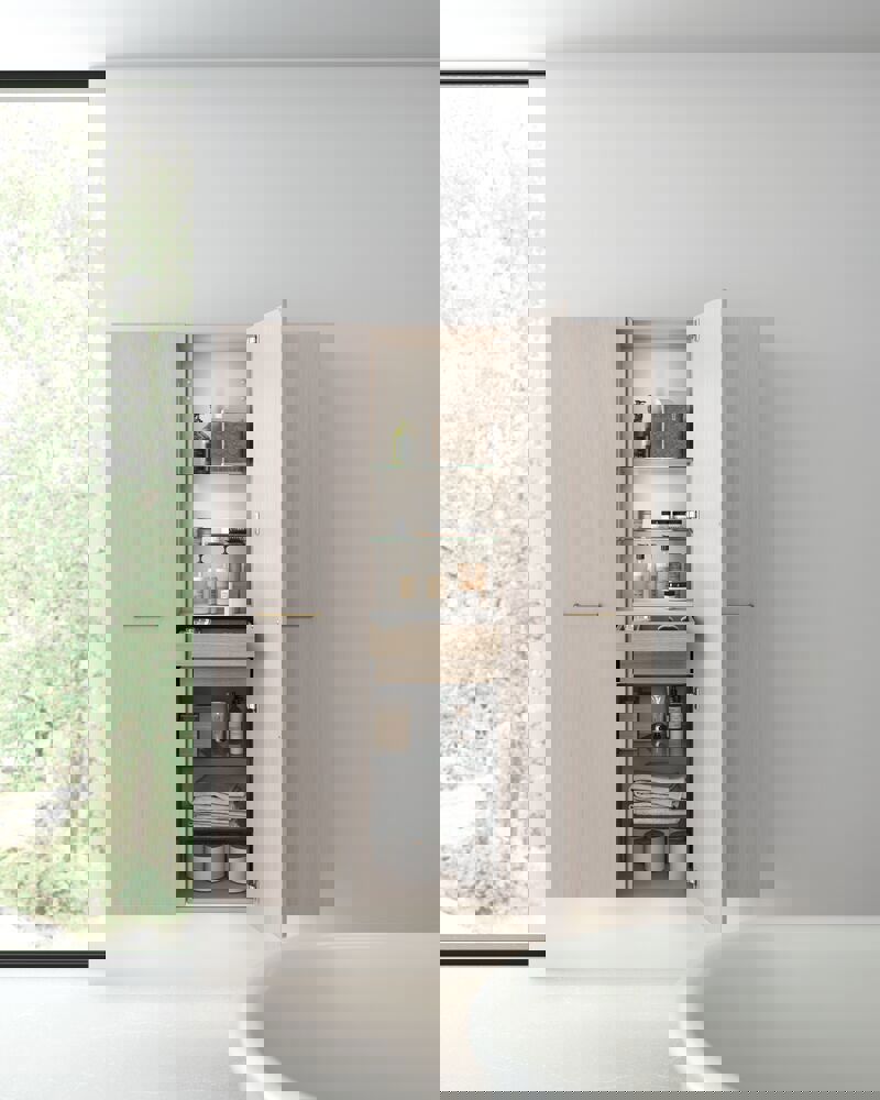 Opbergen in de badkamer wordt eenvoudig en stijlvol met de Dansani Calidris hoge kasten. Deze kasten zijn naast fuctioneel ook prachtig om te zien met een design dat perfect past in moderne badkamerinterieurs. Met slimme planchets en vakken kun je in de Calidris hoge kasten alles georganiseerd opbergen, van handdoeken en toiletartikelen tot schoonheidsproducten. Het elegante ontwerp en de strakke lijnen van de hoge kasten brengen een gevoel van orde en harmonie in de badkameromgeving. Let op: er geldt een opstarttarief (BI1) per eiken en wenskleur. Deze wordt eenmalig betaald per eiken en wenskleur, ongeacht het aantal producten. Vergeet niet de kleine praktische dingen aan je badkamermeubels toe te voegen waar je dagelijks plezier van hebt. Bijvoorbeeld verlichting in lades en kastjes, ingebouwde stopcontacten en gedimde sensorlampjes onder de meubels om nachtelijke bezoeken aan de badkamer te begeleiden. Opties worden tegelijk met je meubels bested.