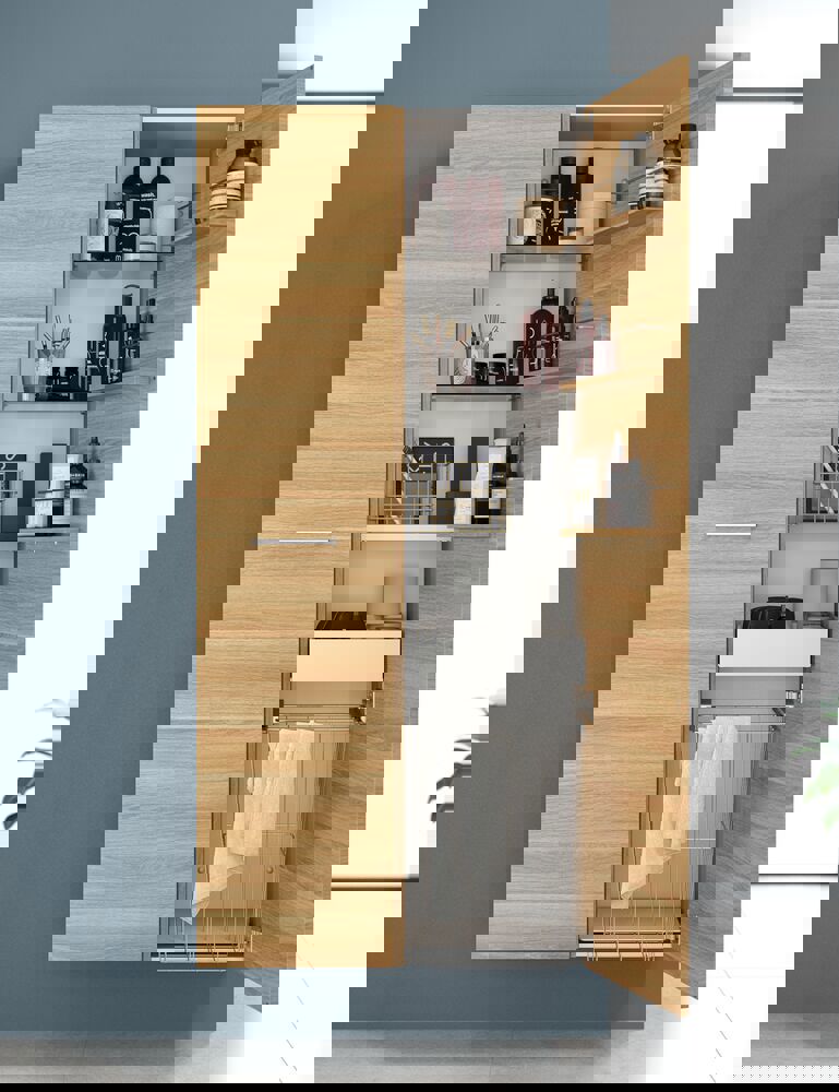 Maak gebruik van elke centimeter ruimte in je badkamer met de Dansani Mido+ hoge kast. In een hoge kast passen al je badkamerspullen, dus als je de ruimte hebt, raden we zeker een hoge kast aan voor je badkamer. In deze hoge kast vind je 1 houten legplank, 4 glazen legplanken en 3 opbergrekken in de deur zelf, waardoor je veel overzichtelijke ruimte hebt en je je badkamer optimaal kunt inrichten. Ervaar een nieuwe dimensie van orde en design in je badkamer met de Dansani Mido+ hoge kast.