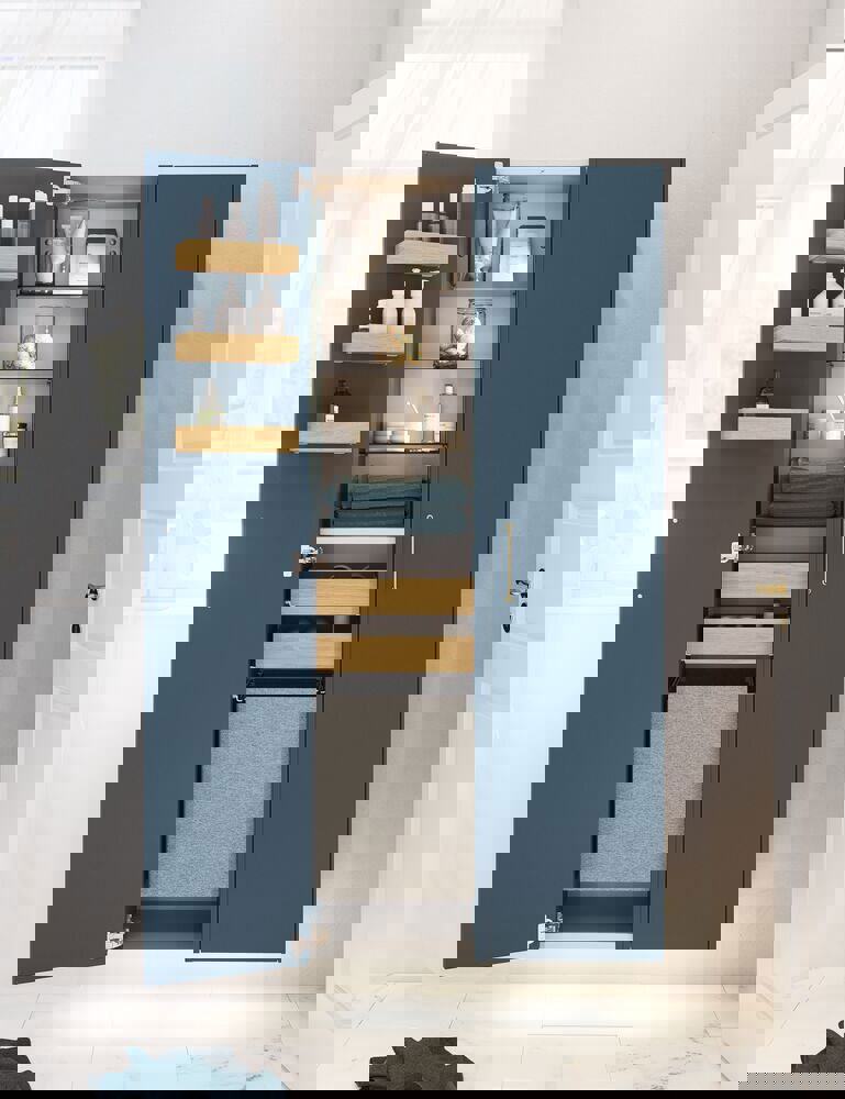 Upgrade je badkamer met een stijlvolle hoge kast met gladde front. Met een hoogte van 176 cm en een diepte van 35 cm biedt deze kast veel opbergruimte voor alles, van handdoeken en toiletartikelen tot extra beddengoed. De kast is uitgerust met één houten plank en vijf glazen planken, waardoor je je badkamerartikelen georganiseerd en binnen handbereik kunt houden. Het gladde oppervlak geeft een minimalistische en moderne uitstraling die elke badkamer omtovert tot een uitnodigend toevluchtsoord. Let op: er geldt een opstarttarief (BI1) voor producten met wenskleur. Deze wordt eenmalig betaald per wenskleur, ongeacht het aantal producten. Vergeet niet de kleine praktische dingen aan je badkamermeubels toe te voegen waar je dagelijks plezier van hebt. Bijvoorbeeld verlichting in lades en kastjes, ingebouwde stopcontacten en gedimde sensorlampjes onder de meubels om nachtelijke bezoeken aan de badkamer te begeleiden. Opties worden tegelijk met je meubels bested.