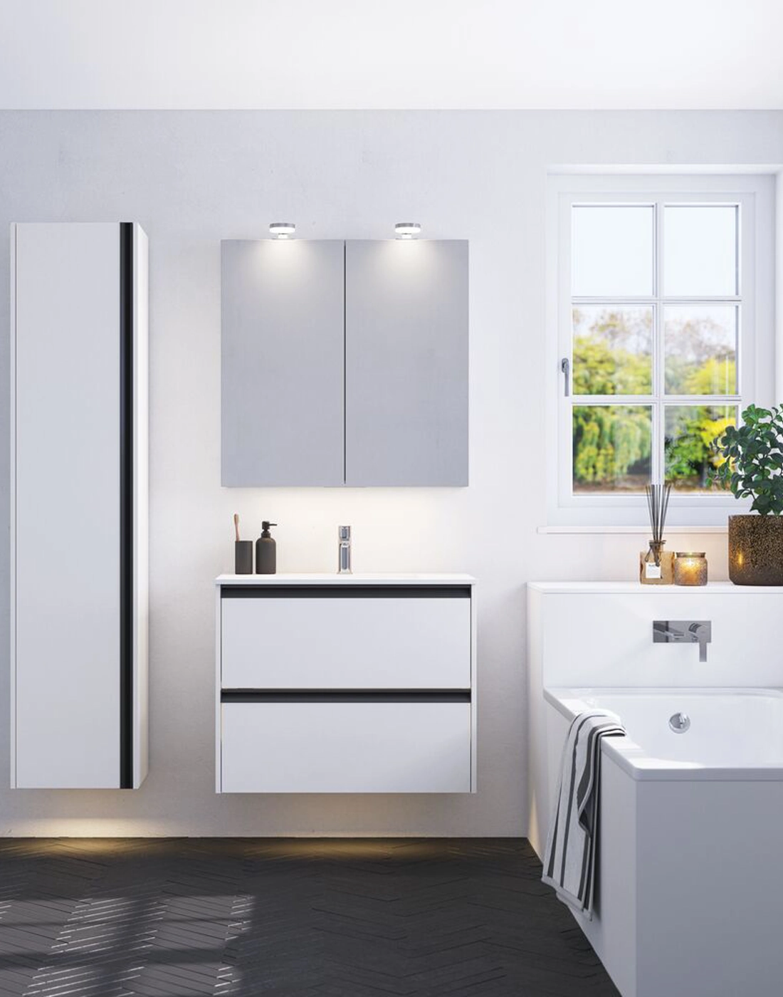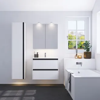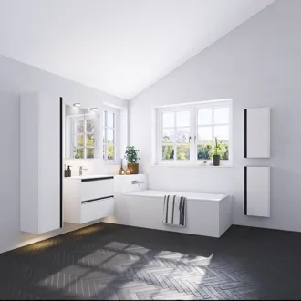 De hoge kast in versie B met geïntegreerde greep is perfect voor wie stijl en functionaliteit zoekt. Met één houten plank en drie verkorte glazen planken is deze kast ideaal voor het opbergen van verschillende badkamerartikelen. De drie houten bakken aan de deur zijn perfect voor kleine items, terwijl de twee glazen planken je favoriete producten laten zien. De elegante zwarte kleur van de greep creëert een mooi contrast en voegt een verfijnde touch toe aan je badkamer. Let op: er geldt een opstarttarief (BI1) voor producten met wenskleur. Deze wordt eenmalig betaald per wenskleur, ongeacht het aantal producten. Vergeet niet de kleine praktische dingen aan je badkamermeubels toe te voegen waar je dagelijks plezier van hebt. Bijvoorbeeld verlichting in lades en kastjes, ingebouwde stopcontacten en gedimde sensorlampjes onder de meubels om nachtelijke bezoeken aan de badkamer te begeleiden. Opties worden tegelijk met je meubels bested.