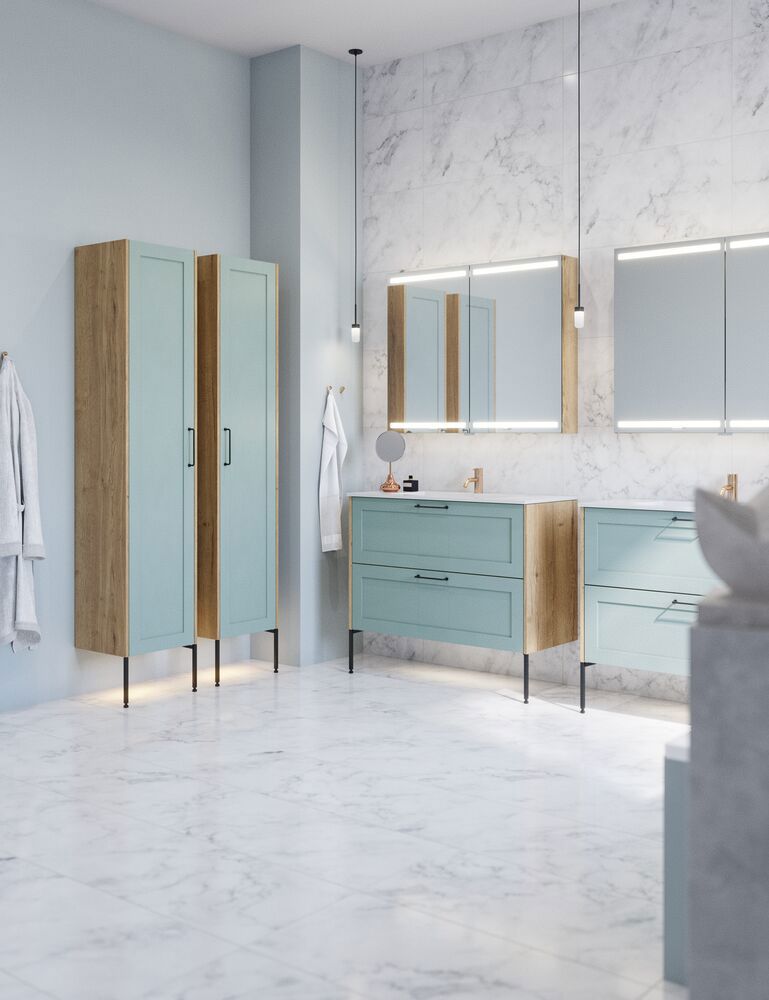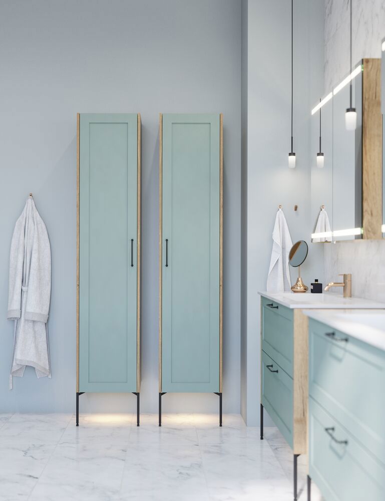De hoge kast met raamwerk front in versie B is ontworpen om je zowel functionaliteit als stijl te bieden. Met één houten plank en drie verkorte glazen planken is deze kast ideaal voor het opbergen van verschillende badkamerartikelen. De drie houten bakken aan de deur bieden extra opbergmogelijkheden voor kleinere items, zoals cosmetica en medicijnen, terwijl de twee glazen planken perfect zijn om je favoriete producten uit te stallen. De klassieke stijl van het raamwerk front voegt een tijdloze uitstraling toe aan je badkamer. Let op: er geldt een opstarttarief (BI1) voor producten met wenskleur. Deze wordt eenmalig betaald per wenskleur, ongeacht het aantal producten. Vergeet niet de kleine praktische dingen aan je badkamermeubels toe te voegen waar je dagelijks plezier van hebt. Bijvoorbeeld verlichting in lades en kastjes, ingebouwde stopcontacten en gedimde sensorlampjes onder de meubels om nachtelijke bezoeken aan de badkamer te begeleiden. Opties worden tegelijk met je meubels bested.