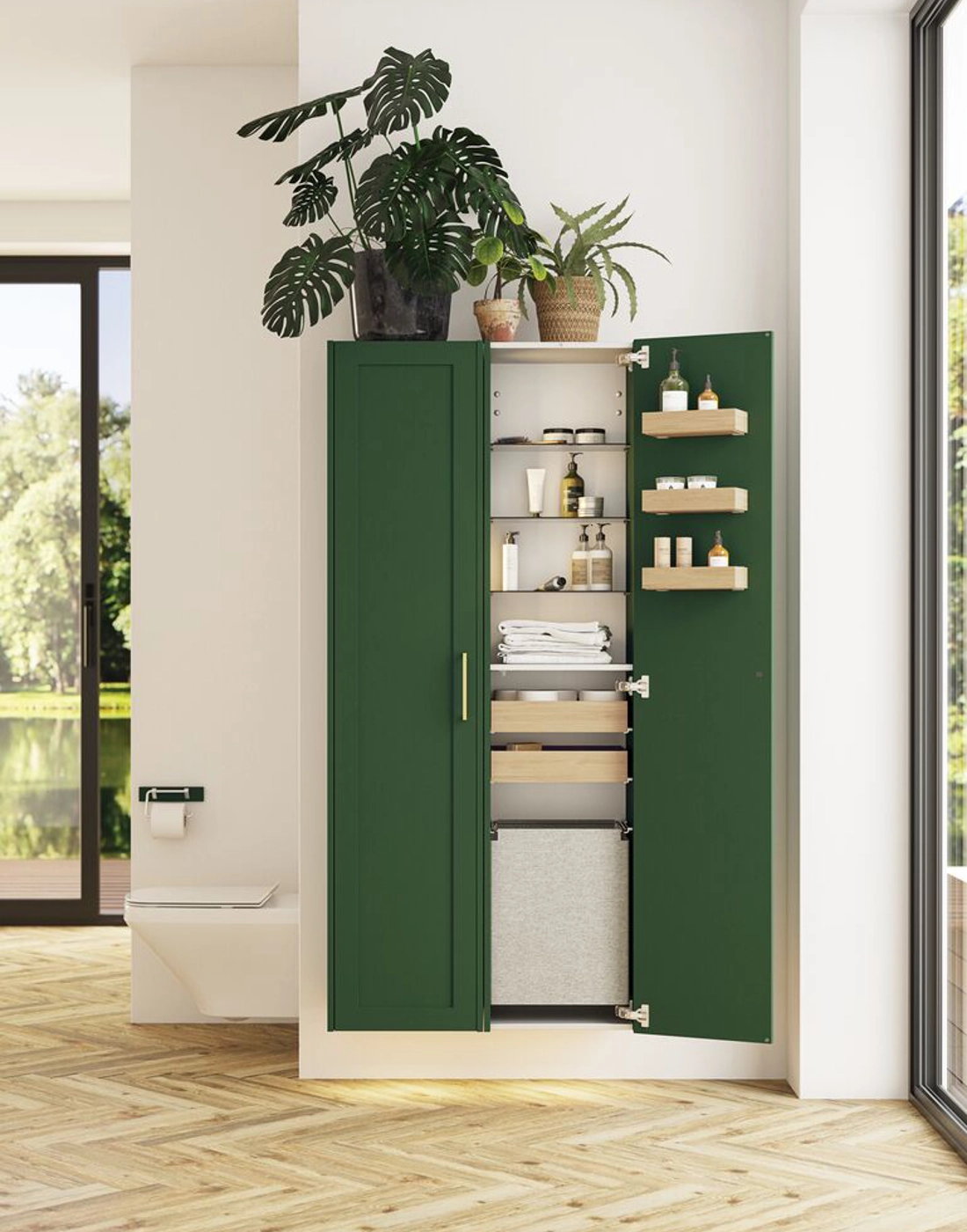 Voor een combinatie van elegantie en functionaliteit, kies de hoge kast met raamwerk front in versie C. Deze kast bevat één houten plank, drie verkorte glazen planken, drie houten bakken aan de deur, twee uittrekbare laden en een waszak. Deze combinatie biedt volop ruimte om je badkamer georganiseerd te houden, terwijl het klassieke raamwerk front een warme en uitnodigende sfeer creëert. Maak van je badkamer een toevluchtsoord waar je kunt ontspannen en genieten van je omgeving. Let op: er geldt een opstarttarief (BI1) voor producten met wenskleur. Deze wordt eenmalig betaald per wenskleur, ongeacht het aantal producten. Vergeet niet de kleine praktische dingen aan je badkamermeubels toe te voegen waar je dagelijks plezier van hebt. Bijvoorbeeld verlichting in lades en kastjes, ingebouwde stopcontacten en gedimde sensorlampjes onder de meubels om nachtelijke bezoeken aan de badkamer te begeleiden. Opties worden tegelijk met je meubels bested.