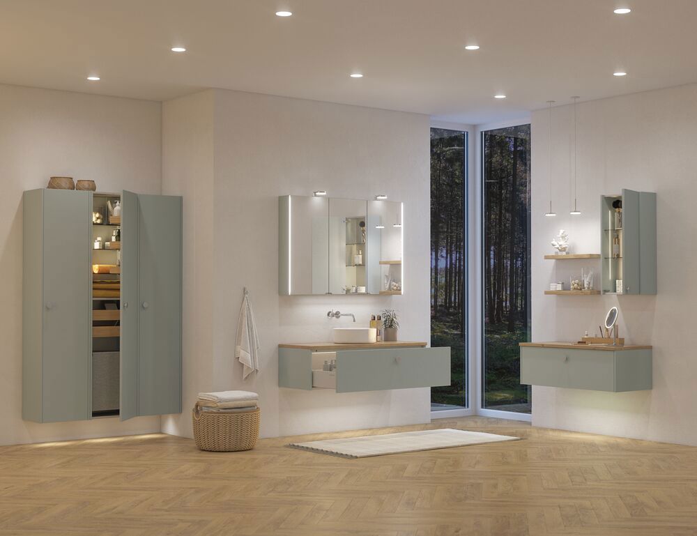Kies voor de hoge kast met gladde front in versie C voor de ultieme opbergoplossing. Deze kast heeft één houten plank, drie verkorte glazen planken, drie houten bakken aan de deur, twee uittrekbare laden en een waszak. Dit is ideaal om je badkamer netjes en opgeruimd te houden, zodat je gemakkelijk je dagelijkse benodigdheden kunt vinden. De gladde afwerking en het elegante ontwerp maken het een centraal element in je badkamer dat zowel functioneel als esthetisch aantrekkelijk is. Let op: er geldt een opstarttarief (BI1) voor producten met wenskleur. Deze wordt eenmalig betaald per wenskleur, ongeacht het aantal producten. Vergeet niet de kleine praktische dingen aan je badkamermeubels toe te voegen waar je dagelijks plezier van hebt. Bijvoorbeeld verlichting in lades en kastjes, ingebouwde stopcontacten en gedimde sensorlampjes onder de meubels om nachtelijke bezoeken aan de badkamer te begeleiden. Opties worden tegelijk met je meubels bested.