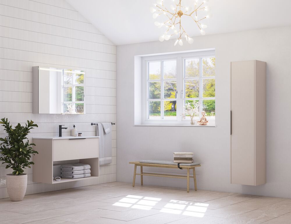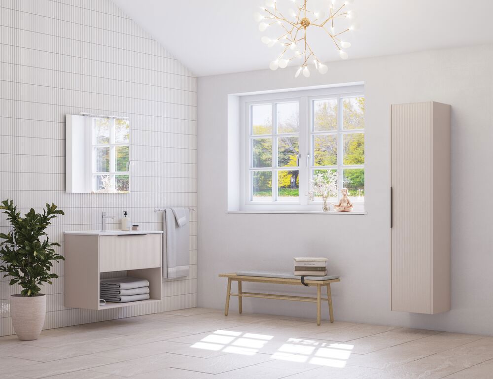 Deze hoge kast combineert de flexibiliteit van een omkeerbare deur met een elegante geribbeldte voorkant die een modern tintje aan je badkamer geeft. Binnenin vind je een houten legplank en 4 glazen legplanken, zodat je genoeg ruimte hebt om je toiletspullen te organiseren. De kast is verkrijgbaar in wit, zandkleurig of lichtblauw en met de gemonteerde handgreep is de kast direct klaar voor gebruik.