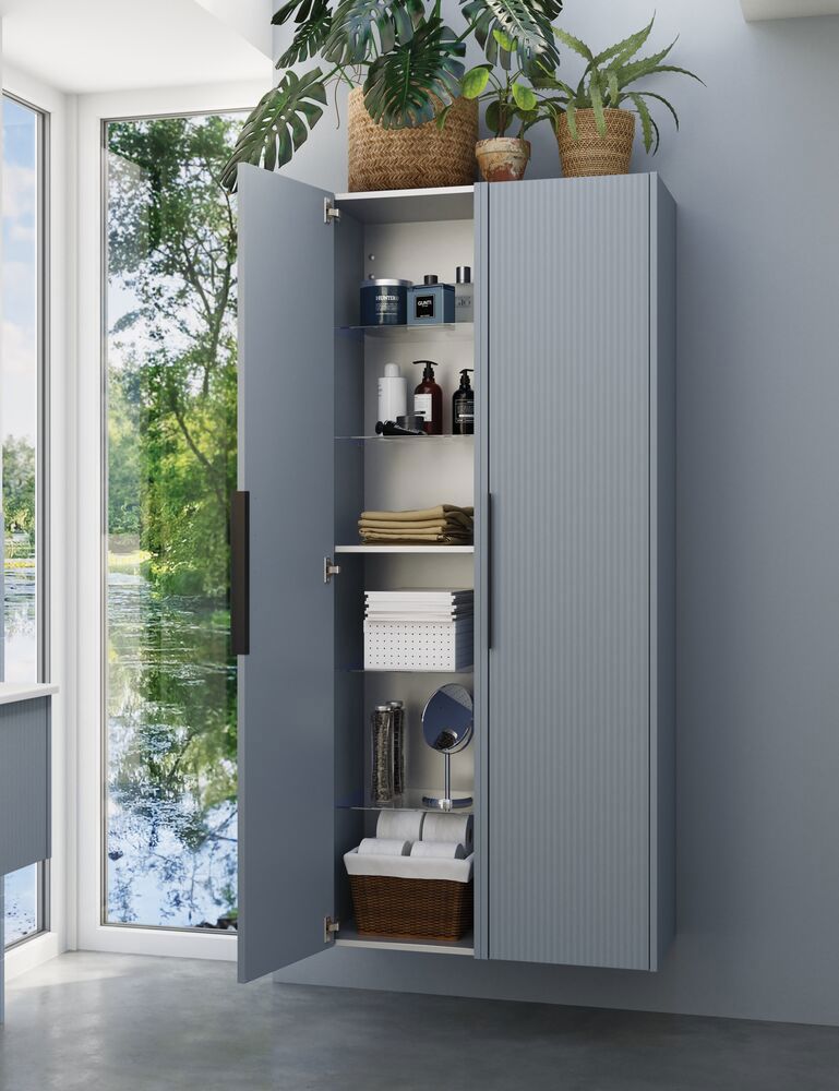 Deze hoge kast combineert de flexibiliteit van een omkeerbare deur met een elegante geribbeldte voorkant die een modern tintje aan je badkamer geeft. Binnenin vind je een houten legplank en 4 glazen legplanken, zodat je genoeg ruimte hebt om je toiletspullen te organiseren. De kast is verkrijgbaar in wit, zandkleurig of lichtblauw en met de gemonteerde handgreep is de kast direct klaar voor gebruik.