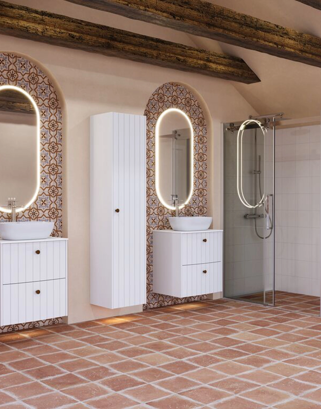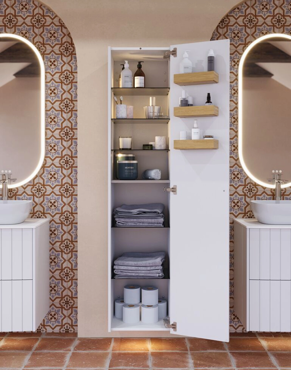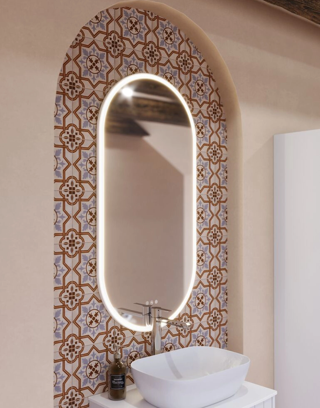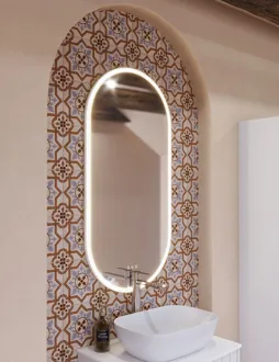 De ovale Hoop spiegel geeft een stijlvolle en moderne uitstraling met zijn unieke, zwevende frame. Het gebogen binnenframe leidt het licht gelijkmatig naar voren en creëert een zacht, diffuus licht dat een aangename verlichting biedt zonder te verblinden. De spiegel is voorzien van een lichtregeling, zodat je de helderheid eenvoudig kunt aanpassen aan je behoefte, of het nu voor make-up of een ontspannende sfeer is. De Hoop spiegel is standaard verkrijgbaar met een zwart frame, maar het is ook mogelijk om het buitenste frame in een speciale kleur te laten lakken die bij je badkamer past. Je kunt een gemonteerd spiegelverwarming voor de spiegel kopen om te voorkomen dat de spiegel beslaat tijdens het douchen. Let op: er geldt een opstarttarief (BI1) voor producten met wenskleur. Deze wordt eenmalig betaald per wenskleur, ongeacht het aantal producten.