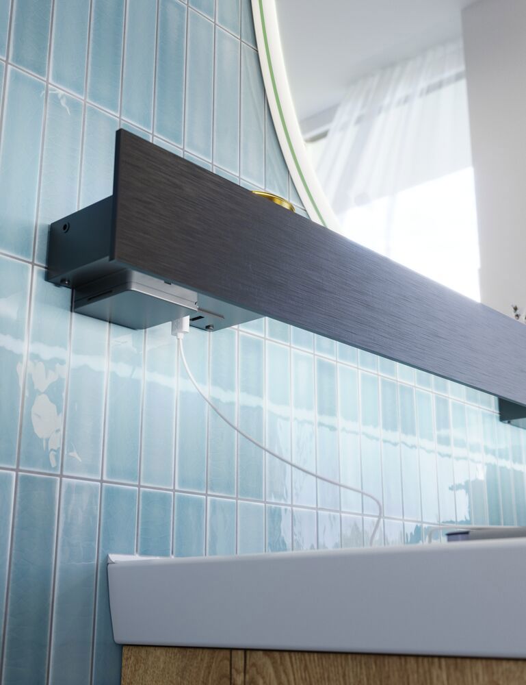 Illumi is een unieke plank, gekenmerkt door zijn zwarte aluminium rand en donker getinte glazen planchetten, ontworpen als aanvulling op de asymmetrische set waar Illumi verder reikt dan de meubels om een opvallend designelement te creëren. De Illumi is niet alleen een visueel statement, maar heeft ook praktische kenmerken die hem ideaal maken voor de badkamer. De planchetten kunnen worden verwijderd, zodat je de Illumi ook kunt gebruiken als handdoekhouder. Er zitten lampjes in de plank die zorgen voor mooi licht boven je wastafel en badmeubel. Er zit zelfs een stopcontact in de plank, zodat je gemakkelijk je elektrische tandenborstel kunt opladen of je scheerapparaat kunt gebruiken bij de wastafel. De Illumi integreert luxe en gebruiksgemak in je badkamer. Het is meer dan een opbergoplossing; het is een zorgvuldig gekozen designervaring die esthetiek combineert met functionaliteit, waardoor er een badkameromgeving ontstaat die zowel mooi als praktisch is.
