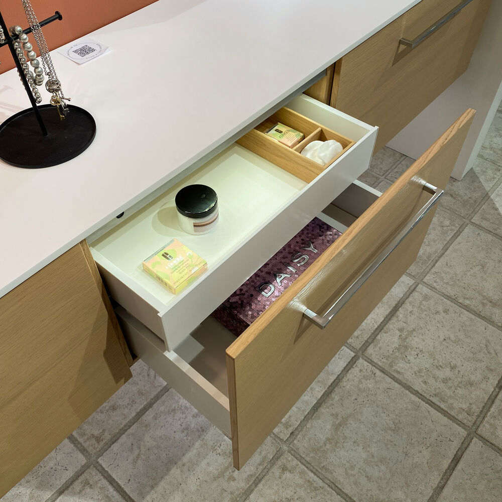 Dansani Calidris 1-ladekasten zijn de ideale oplossing voor slim en stijlvol opbergen in de badkamer. Zonder ruimte voor afvoeren zijn deze kasten voor wie kiest voor een asymmetrische oplossing met een wastafel op maat, of voor wie elders in de badkamer extra opbergruimte wil. Met de ruime lade kun je je badkamer georganiseerd houden en er is genoeg ruimte voor crèmes, shampoo, haardroger en nog veel meer. De Dansani Calidris kast geeft je de mogelijkheid om je badkamer op een samenhangende en mooie manier te organiseren. Let op: er geldt een opstarttarief (BI1) per eiken en wenskleur. Deze wordt eenmalig betaald per eiken en wenskleur, ongeacht het aantal producten. Vergeet niet de kleine praktische dingen aan je badkamermeubels toe te voegen waar je dagelijks plezier van hebt. Bijvoorbeeld verlichting in lades en kastjes, ingebouwde stopcontacten en gedimde sensorlampjes onder de meubels om nachtelijke bezoeken aan de badkamer te begeleiden. Opties worden tegelijk met je meubels bested.