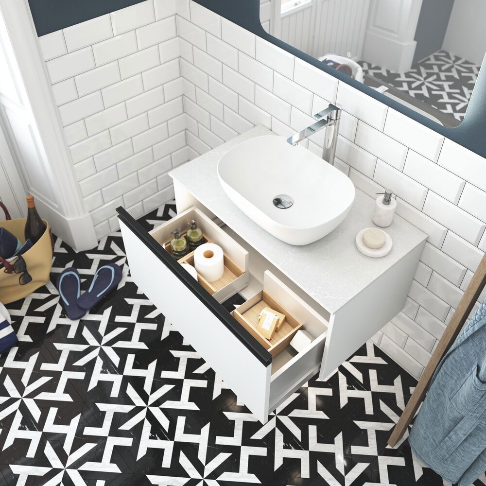 Dansani Calidris kastjes met 2 lades zijn de perfecte oplossing voor wie op zoek is naar slimme en stijlvolle opbergruimte in de badkamer. Met Calidris krijg je doordacht Deens design, en deze kasten zijn ontworpen om ruimte te maximaliseren zonder afbreuk te doen aan functionaliteit of design. In de twee ruime lades kun je gemakkelijk je toiletartikelen, handdoeken en badkamerbenodigdheden organiseren en netjes opbergen. Het ontwerp van de kasten is eenvoudig en tijdloos, waardoor ze een stijlvolle toevoeging zijn aan elke badkamer. Let op: er geldt een opstarttarief (BI1) per eiken en wenskleur. Deze wordt eenmalig betaald per eiken en wenskleur, ongeacht het aantal producten. Vergeet niet de kleine praktische dingen aan je badkamermeubels toe te voegen waar je dagelijks plezier van hebt. Bijvoorbeeld verlichting in lades en kastjes, ingebouwde stopcontacten en gedimde sensorlampjes onder de meubels om nachtelijke bezoeken aan de badkamer te begeleiden. Opties worden tegelijk met je meubels bested.