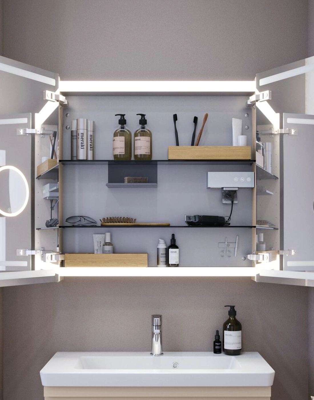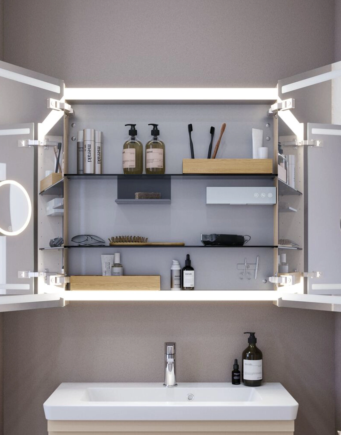 De Level spiegelkast geeft je veel extra opbergruimte in je badkamer. In de spiegelkast vind je verschillende planchets, een vergrootspiegel, een magneetstrip, een verschuifbaar metalen planchet en een stopcontact met USB poorten, zodat je genoeg ruimte hebt voor je tandenborstel, scheerapparaat, crèmes, deodorant en nog veel meer. De spiegelkast heeft boven- en onderverlichting die zowel in lichtsterkte als in kleurtemperatuur kan worden geregeld, zodat je het juiste licht voor jouw behoeften hebt. Let op: er geldt een opstarttarief (BI1) voor producten met wenskleur. Deze wordt eenmalig betaald per wenskleur, ongeacht het aantal producten.