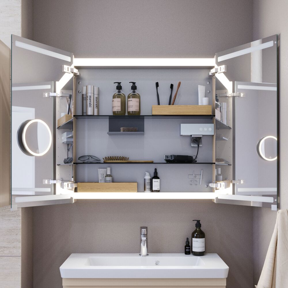 De Level spiegelkast geeft je veel extra opbergruimte in je badkamer. In de spiegelkast vind je verschillende planchets, een vergrootspiegel, een magneetstrip, een verschuifbaar metalen planchet en een stopcontact met USB poorten, zodat je genoeg ruimte hebt voor je tandenborstel, scheerapparaat, crèmes, deodorant en nog veel meer. De spiegelkast heeft boven- en onderverlichting die zowel in lichtsterkte als in kleurtemperatuur kan worden geregeld, zodat je het juiste licht voor jouw behoeften hebt. Let op: er geldt een opstarttarief (BI1) voor producten met wenskleur. Deze wordt eenmalig betaald per wenskleur, ongeacht het aantal producten.
