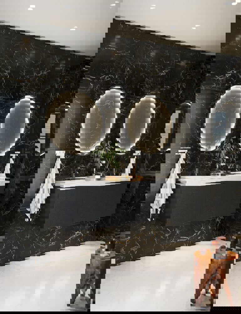 De Moon spiegel is een mooie en elegante ronde spiegel met een lijst waardoor de Moon een decoratief element is in elk interieur. Het frame van de spiegel is gemaakt van robuuste materialen en geeft de spiegel een moderne en stijlvolle uitstraling. Je kunt ook de sterkte enkleurtemperatuur van het licht regelen, want de Moon spiegel is natuurlijk standaard met lichtregeling. Het frame rond de spiegel is verkrijgbaar in verschillende kleuren zoals zwart, wit en messing, zodat je de spiegel kunt aanpassen aan je persoonlijke stijl en inrichting. De spiegel is perfect voor de badkamer of slaapkamer en met de Moon spiegel creëer je een ruimte met elegantie en tijdloze schoonheid. Je kunt een gemonteerd spiegelverwarming voor de spiegel kopen om te voorkomen dat de spiegel beslaat tijdens het douchen.