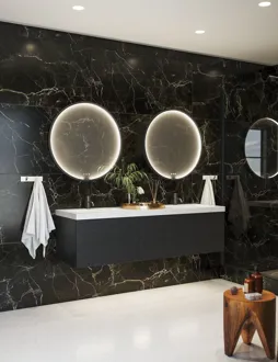 De Moon spiegel is een mooie en elegante ronde spiegel met een lijst waardoor de Moon een decoratief element is in elk interieur. Het frame van de spiegel is gemaakt van robuuste materialen en geeft de spiegel een moderne en stijlvolle uitstraling. Je kunt ook de sterkte enkleurtemperatuur van het licht regelen, want de Moon spiegel is natuurlijk standaard met lichtregeling. Het frame rond de spiegel is verkrijgbaar in verschillende kleuren zoals zwart, wit en messing, zodat je de spiegel kunt aanpassen aan je persoonlijke stijl en inrichting. De spiegel is perfect voor de badkamer of slaapkamer en met de Moon spiegel creëer je een ruimte met elegantie en tijdloze schoonheid. Je kunt een gemonteerd spiegelverwarming voor de spiegel kopen om te voorkomen dat de spiegel beslaat tijdens het douchen.