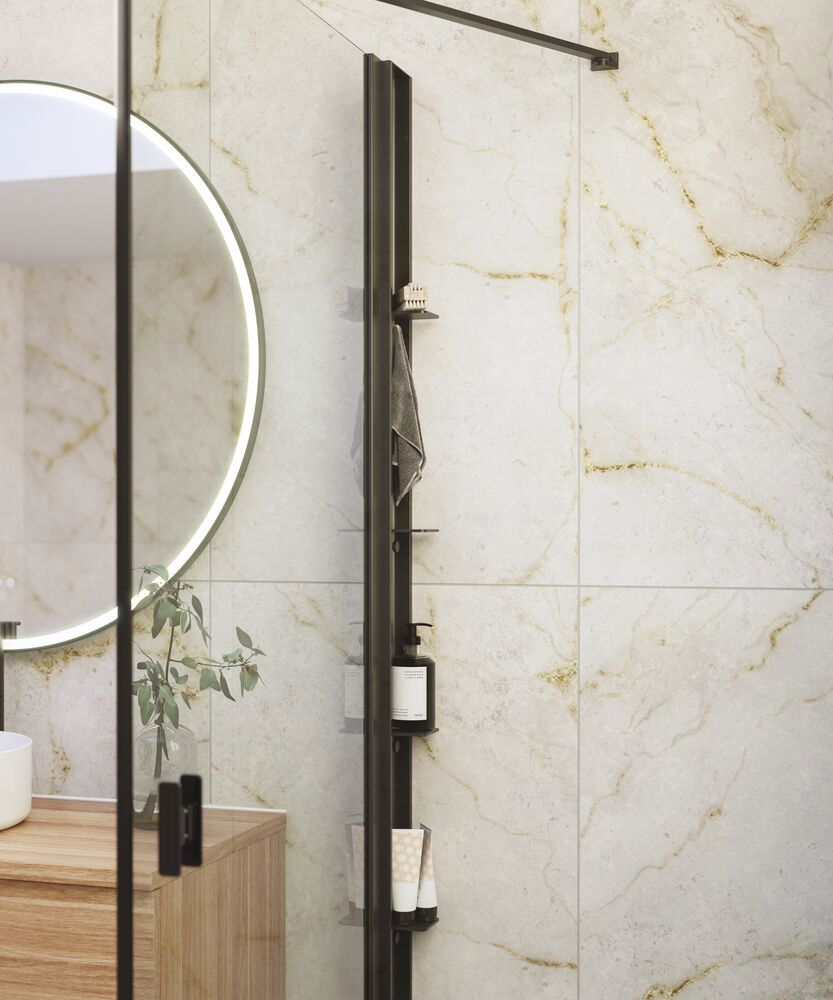 Tower is een innovatieve oplossing die uitzonderlijke opbergruimte in de douche biedt zonder afbreuk te doen aan het uiterlijk van de douche. Tower heeft 5 verwijderbare planchets die perfect zijn voor het organiseren van de producten en verzorgingsartikelen die je in je douche gebruikt. Met de praktische haken kunt u een spons, borstel of andere kleine spullen binnen handbereik ophangen. Om de Tower te plaatsen, kies je gewoon een deur die 10 cm smaller is. Tower is de ideale oplossing voor degenen die de ruimte in hun douche willen optimaliseren zonder afbreuk te doen aan stijl en functionaliteit.