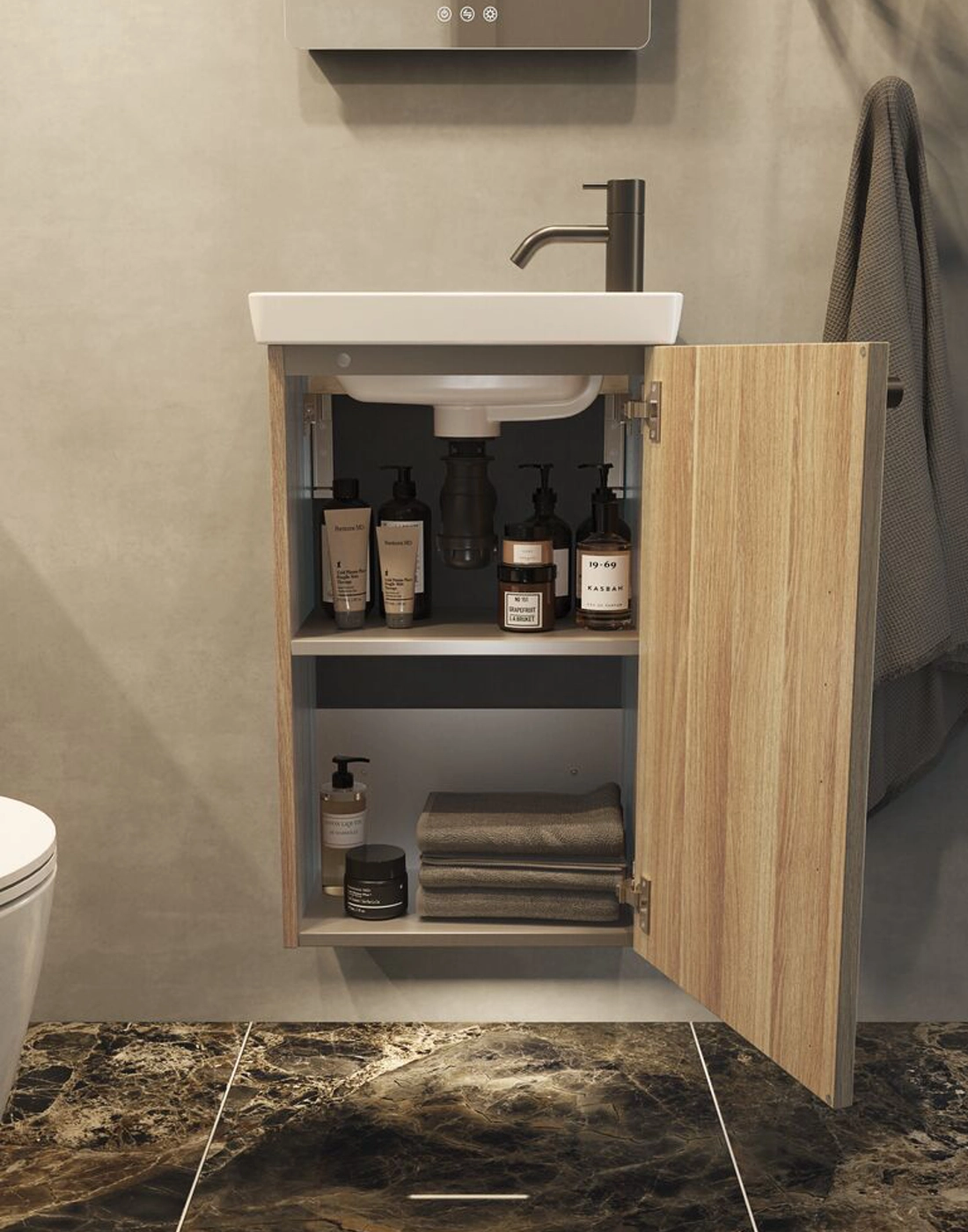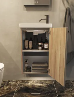 Het meubel met 1 deur is de ideale oplossing voor de toiletruimte. Met een diepte van slechts 26 cm neemt het toiletmeubel minimale ruimte in beslag, maar je krijgt toch een kast met praktische opbergruimte. Het stijlvolle ontwerp past perfect in elk interieur. De kast is zowel functioneel als esthetisch en helpt orde en elegantie te scheppen in je badkamer. Upgrade je ruimte met het badmeubel en geniet van de slimme ruimtebesparende oplossing. Let op: er geldt een opstarttarief (BI1) voor producten met wenskleur. Deze wordt eenmalig betaald per wenskleur, ongeacht het aantal producten. Vergeet niet de kleine praktische dingen aan je badkamermeubels toe te voegen waar je dagelijks plezier van hebt. Bijvoorbeeld verlichting in lades en kastjes, ingebouwde stopcontacten en gedimde sensorlampjes onder de meubels om nachtelijke bezoeken aan de badkamer te begeleiden. Opties worden tegelijk met je meubels bested.
