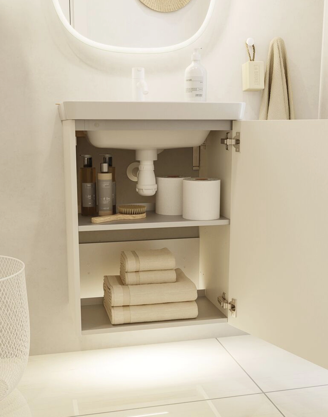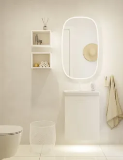 Functioneel design, dat is het badmeubel. Het is perfect voor compacte ruimtes en is verkrijgbaar in verschillende kleuren, zodat je kunt kiezen wat bij jouw stijl en smaak past. Je kunt de kast personaliseren door je eigen handgrepen uit te zoeken. Je kunt er ook voor kiezen om het meubel in je eigen kleur te krijgen, zodat het perfect past bij de rest van de badkamer. Let op: er geldt een opstarttarief (BI1) voor producten met wenskleur. Deze wordt eenmalig betaald per wenskleur, ongeacht het aantal producten. Vergeet niet de kleine praktische dingen aan je badkamermeubels toe te voegen waar je dagelijks plezier van hebt. Bijvoorbeeld verlichting in lades en kastjes, ingebouwde stopcontacten en gedimde sensorlampjes onder de meubels om nachtelijke bezoeken aan de badkamer te begeleiden. Opties worden tegelijk met je meubels bested.