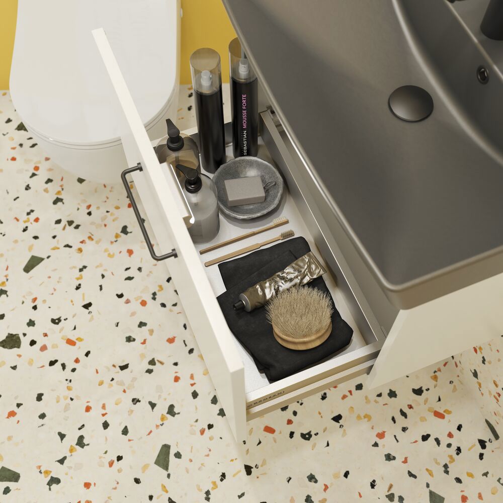 Dit stijlvolle badmeubel met één brede lade combineert functionaliteit met Scandinavische elegantie. De lade is ruim en volledig uittrekbaar, waardoor je een perfect overzicht hebt van je dagelijkse producten. Soft-close en hoogwaardige glijders zorgen telkens weer voor een geruisloze en comfortabele sluiting. De bijgeleverde zwarte handgreep benadrukt de moderne look, terwijl de gestreepte witte matte afwerking textuur en een rustige, verfijnde look toevoegt aan de badkamer.