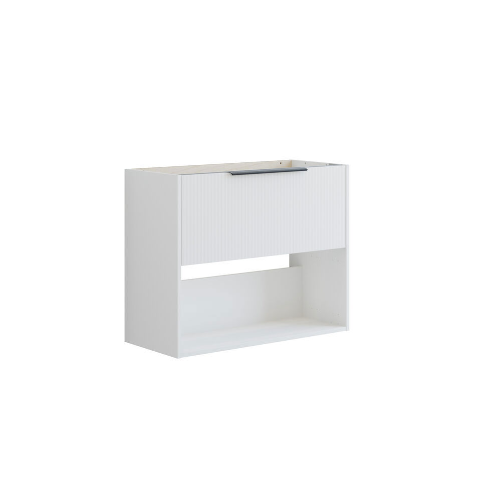 Een ruim en elegant badmeubel met één grote lade die je veel opbergruimte en gemakkelijke toegang tot je spullen geeft. De lade is voorzien van soft-close en glijders zodat hij altijd stil en soepel sluit. De gestreepte witte matte afwerking geeft het meubel een lichte en exclusieve uitstraling die goed samengaat met het zwarte handvat. Een voor de hand liggende oplossing voor wie zowel esthetiek als functionaliteit wil in de badkamer.