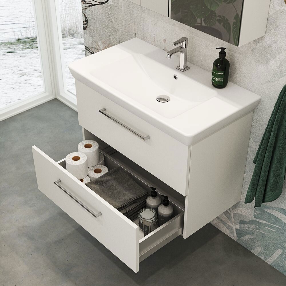 Vernieuw je badkamer met het Dansani Mido+ badmeubel met 1 lade - hier in een diepte van 44 cm. Dit badmeubel geeft je de extra opbergruimte die je nodig hebt zonder afbreuk te doen aan design en stijl. Met gedempt sluitende lade, duurzame materialen en een verfijnd design is dit meubel een perfecte combinatie van functionaliteit en elegantie. Creëer een georganiseerde en stijlvolle sfeer in je badkamer met Dansani Mido+. Alle Mido+ meubels worden geleverd met de klassieke handgreep Base in chroom. Je kunt een andere greep kiezen voor een andere look, maar vergeet niet dat deze samen met je meubels moet worden besteld. Vergeet niet de kleine praktische dingen aan je badkamermeubels toe te voegen waar je dagelijks plezier van hebt. Bijvoorbeeld verlichting en ladeverdelers voor je lades.