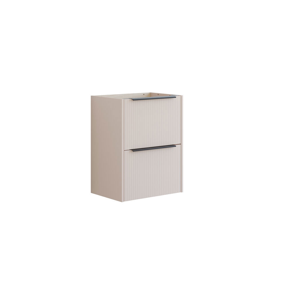 Dit compacte maar ruime badmeubel met twee lades is perfect voor kleinere badkamers waar opbergruimte toch belangrijk is. De lades bieden een goed overzicht en sluiten zacht en geruisloos met soft-close en topkwaliteit glijders. De gestreepte witte matte afwerking geeft het ontwerp een moderne en levendige touch, terwijl de zwarte handgreep voor een stijlvol contrast zorgt. Een functioneel meubel met een elegante uitstraling.